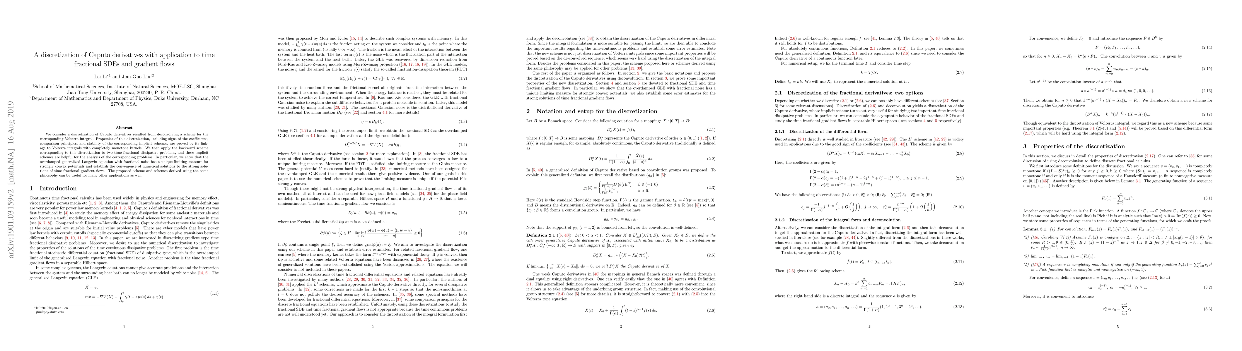 We consider a discretization of Caputo derivatives resulted from deconvolving a scheme for the corresponding Volterra integral. Properties of this discretization, including signs of the coefficients, comparison principles, and stability of the corresponding implicit schemes, are proved by its linkage to Volterra integrals with completely monotone kernels. We then apply the backward scheme corresponding to this discretization to two time fractional dissipative problems, and these implicit schemes are helpful for the analysis of the corresponding problems. In particular, we show that the overdamped generalized Langevin equation with fractional noise has a unique limiting measure for strongly convex potentials and establish the convergence of numerical solutions to the strong solutions of time fractional gradient flows. The proposed scheme and schemes derived using the same philosophy can be useful for many other applications as well.