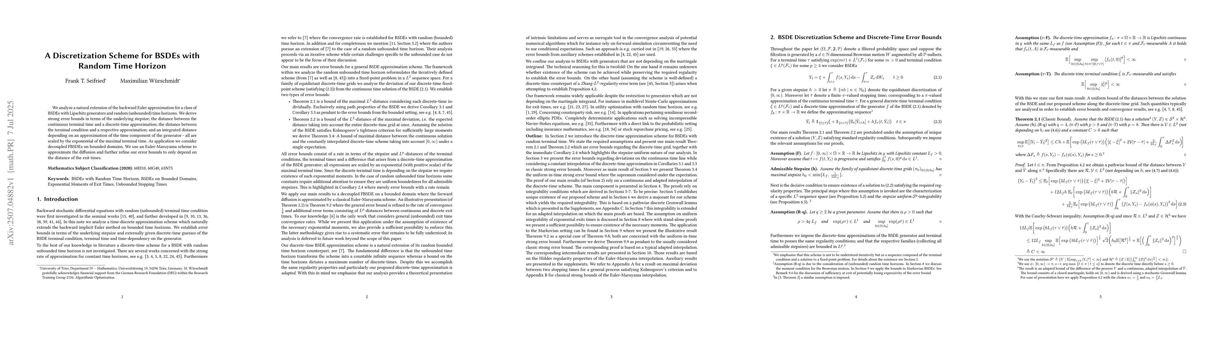 We analyze a natural extension of the backward Euler approximation for a class of BSDEs with Lipschitz generators and random (unbounded) time horizons. We derive strong error bounds in terms of the underlying stepsize; the distance between the continuous terminal time and a discrete-time approximation; the distance between the terminal condition and a respective approximation; and an integrated distance depending on an approximation of the time component of the generator - all are scaled by the exponential of the maximal terminal time. As application we consider decoupled FBSDEs on bounded domains. We use an Euler-Maruyama scheme to approximate the diffusion and further refine our error bounds to only depend on the distance of the exit times.