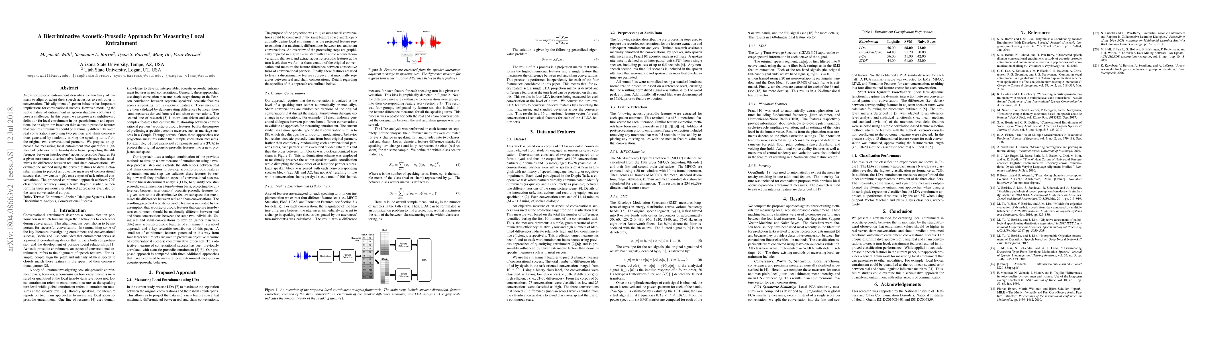 This paper proposes a discriminative acoustic-prosodic approach to measure local entrainment in conversations, defining it as the alignment of speech features between partners. The method achieves 72% classification accuracy in predicting conversational success, outperforming previous methods.