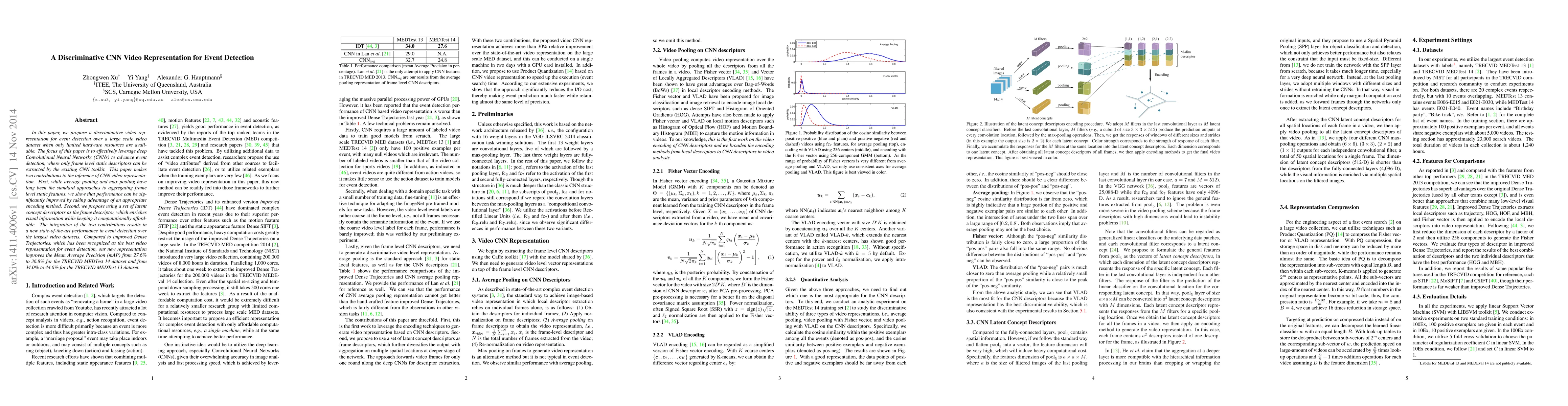 This paper proposes a discriminative CNN video representation for event detection, leveraging deep CNNs with improved encoding methods and latent concept descriptors to enhance performance. The new approach achieves a significant improvement in Mean Average Precision on large-scale video datasets, outperforming the previous best method.