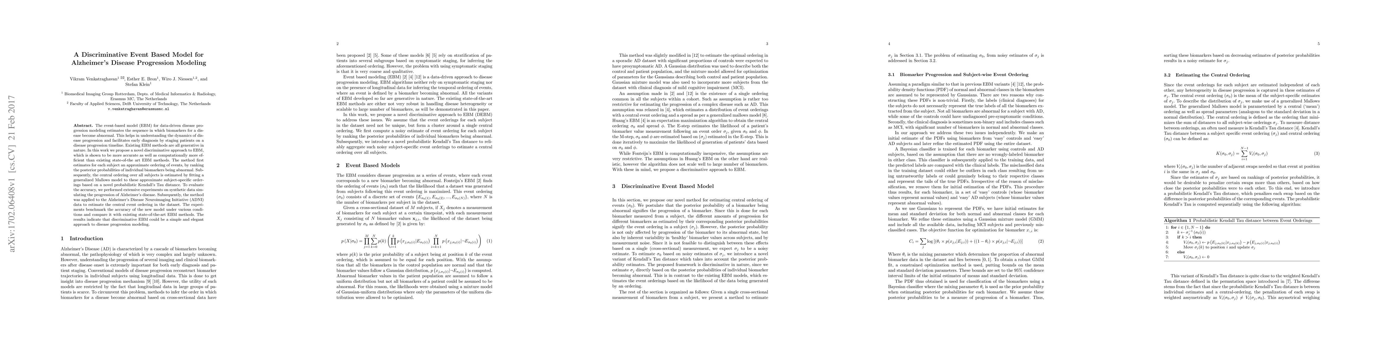 This paper proposes a novel discriminative event-based model (EBM) for Alzheimer's disease progression, which is more accurate and computationally efficient than existing generative methods. The model estimates the sequence of biomarker abnormalities and was validated using synthetic data and ADNI data, showing promising results.