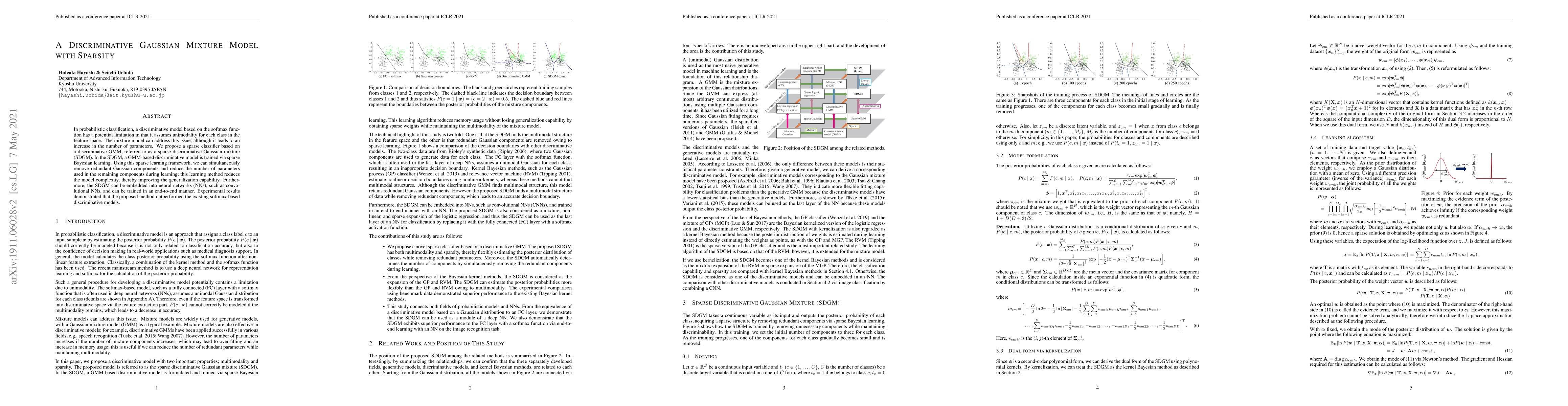 The paper proposes a sparse discriminative Gaussian mixture model (SDGM) to address the unimodality assumption in softmax-based classification, reducing model complexity through sparse Bayesian learning and improving generalization. The SDGM can be integrated into neural networks and outperforms existing softmax models in experiments.