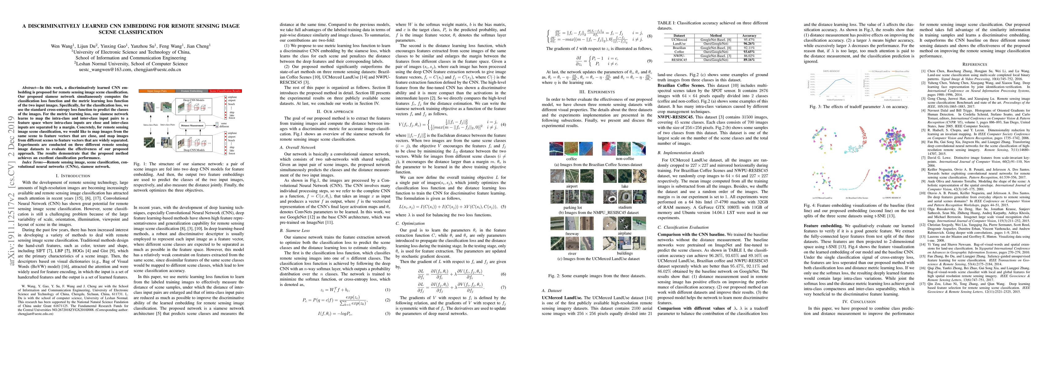 This paper proposes a discriminatively learned CNN embedding using a siamese network for remote sensing image scene classification. The method combines classification and metric learning losses to map similar scenes closely and distinct scenes far apart in feature space, achieving superior classification performance on multiple datasets.