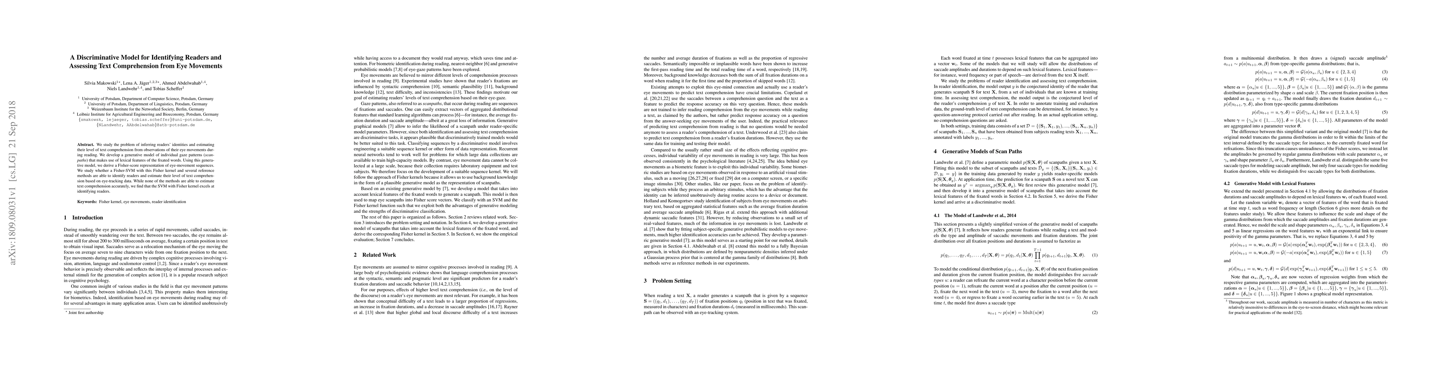 This paper develops a discriminative model to identify readers and assess text comprehension from eye movement data, using a generative model of gaze patterns and a Fisher-SVM. While the model excels at identifying readers, it does not accurately estimate text comprehension levels.