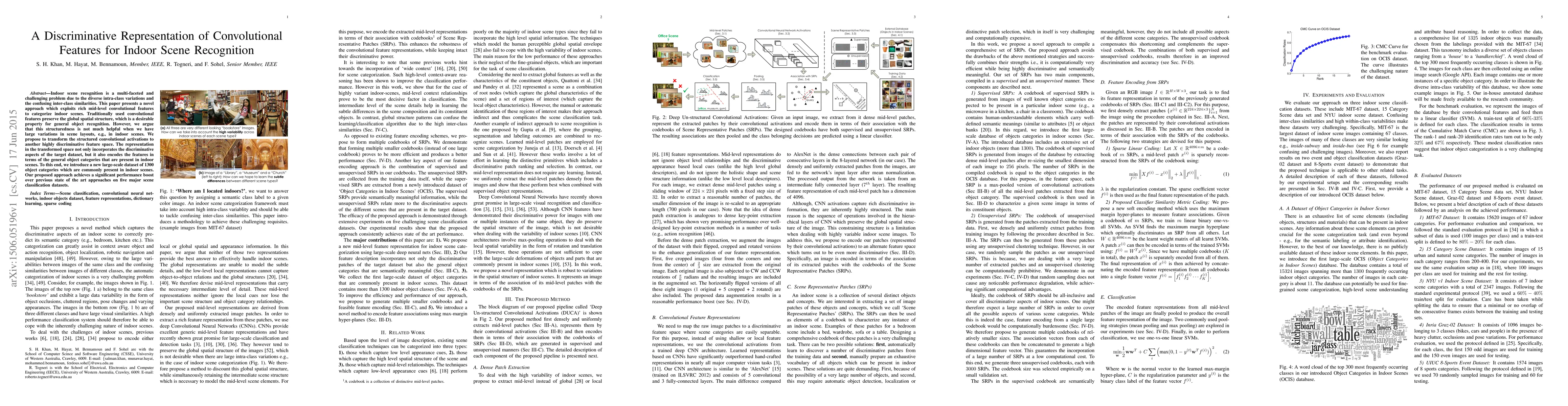 The paper proposes a novel approach for indoor scene recognition by transforming structured convolutional activations into a highly discriminative feature space. It introduces a large-scale dataset of 1300 object categories commonly present in indoor scenes and combines supervised and unsupervised patch representation (SRP) codebooks.