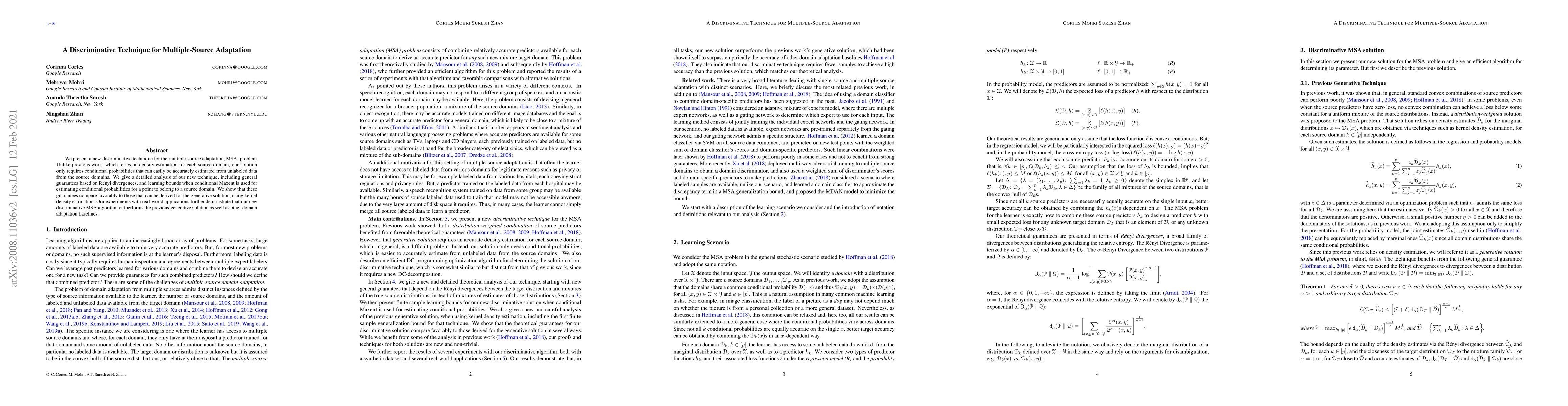 We present a new discriminative technique for the multiple-source adaptation, MSA, problem. Unlike previous work, which relies on density estimation for each source domain, our solution only requires conditional probabilities that can easily be accurately estimated from unlabeled data from the source domains. We give a detailed analysis of our new technique, including general guarantees based on R\'enyi divergences, and learning bounds when conditional Maxent is used for estimating conditional probabilities for a point to belong to a source domain. We show that these guarantees compare favorably to those that can be derived for the generative solution, using kernel density estimation. Our experiments with real-world applications further demonstrate that our new discriminative MSA algorithm outperforms the previous generative solution as well as other domain adaptation baselines.