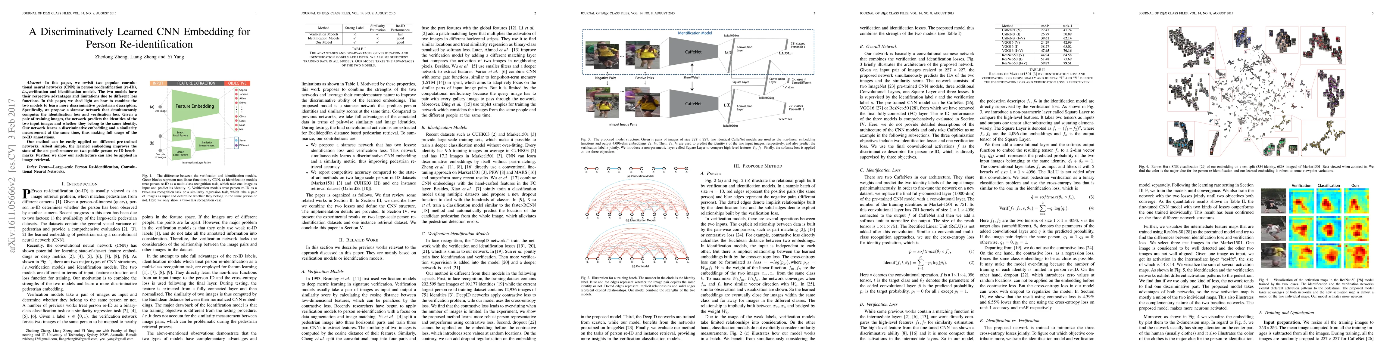 This paper proposes a discriminatively learned CNN embedding for person re-identification by combining verification and classification models through a siamese network. The network simultaneously learns identification and verification losses, achieving state-of-the-art performance on public benchmarks and demonstrating applicability in image retrieval.