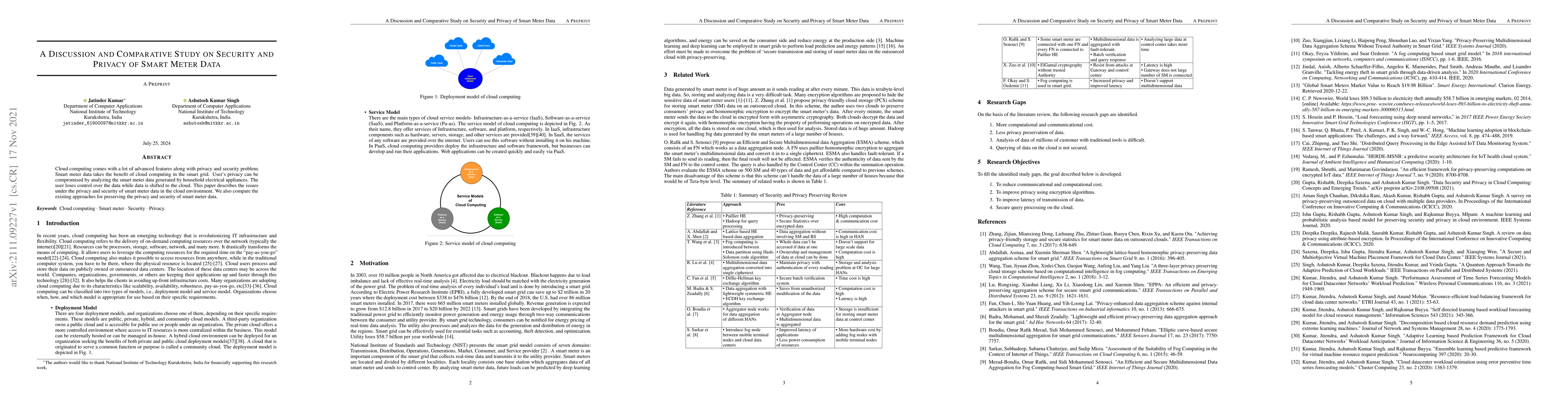 This paper discusses the privacy and security challenges of smart meter data in cloud environments, highlighting the risks of data compromise and loss of control. It also compares various existing approaches for safeguarding the privacy and security of smart meter data.