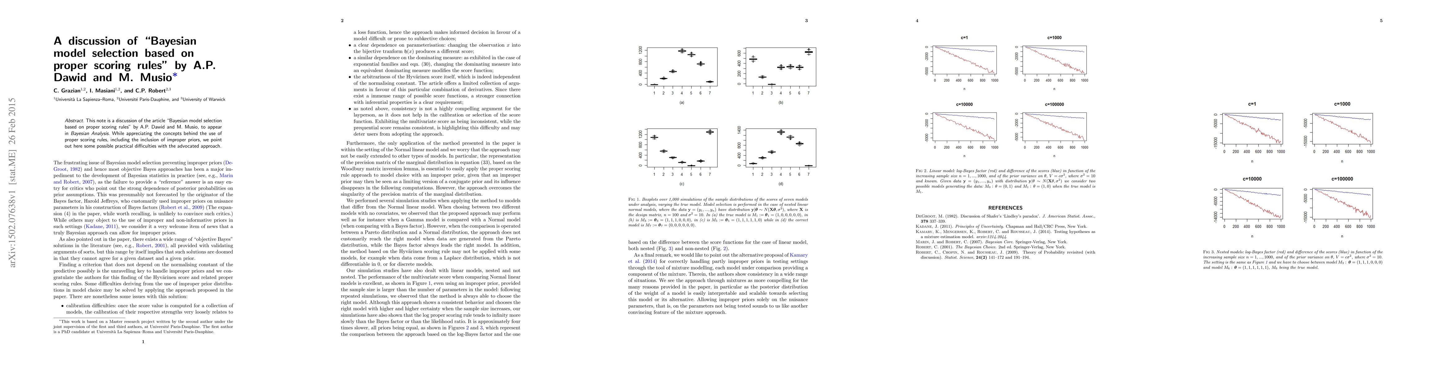 This paper discusses the use of proper scoring rules for Bayesian model selection, highlighting potential practical challenges despite acknowledging the conceptual benefits, including the flexibility of improper priors.