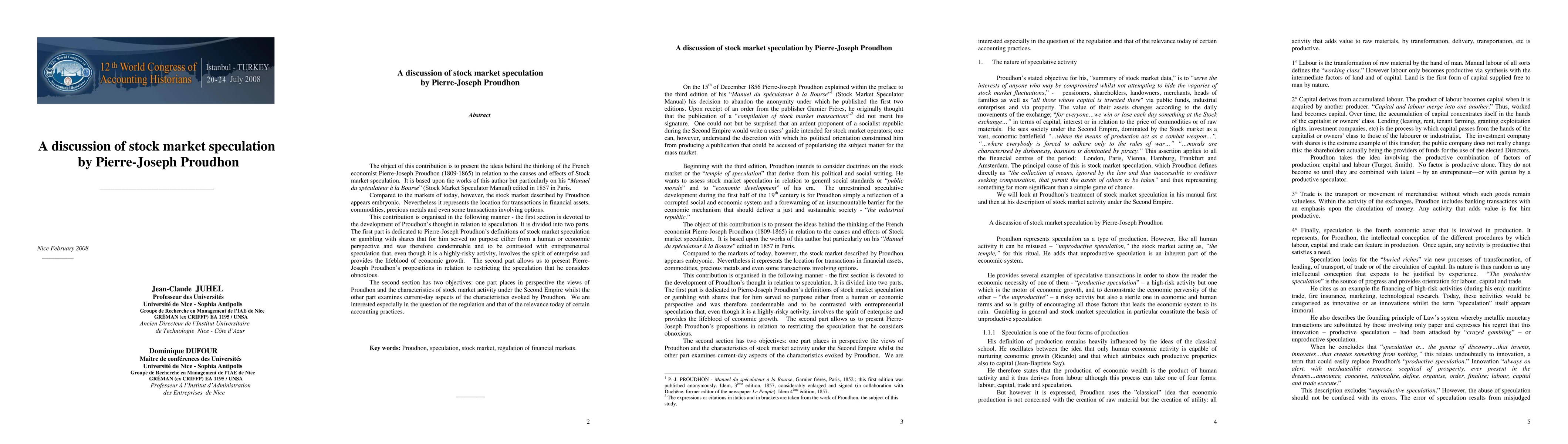 The object of this contribution is to present the ideas behind the thinking of the French economist Pierre-Joseph Proudhon (1809-1865) in relation to the causes and effects of Stock market speculation. It is based upon the works of this author but particularly on his "Manuel du sp\'eculateur \`a la Bourse" (Stock Market Speculator Manual) edited in 1857 in Paris. Compared to the markets of today, however, the stock market described by Proudhon appears embryonic. Nevertheless it represents the location for transactions in financial assets, commodities, precious metals and even some transactions involving options. This contribution is organised in the following manner - the first section is devoted to the development of Proudhon's thought in relation to speculation. It is divided into two parts. The first part is dedicated to Pierre-Joseph Proudhon's definitions of stock market speculation or gambling with shares that for him served no purpose either from a human or economic perspective and was therefore condemnable and to be contrasted with entrepreneurial speculation that, even though it is a highly-risky activity, involves the spirit of enterprise and provides the lifeblood of economic growth. The second part allows us to present Pierre-Joseph Proudhon's propositions in relation to restricting the speculation that he considers obnoxious. The second section has two objectives: one part places in perspective the views of Proudhon and the characteristics of stock market activity under the Second Empire whilst the other part examines current-day aspects of the characteristics evoked by Proudhon. We are interested especially in the question of the regulation and that of the relevance today of certain accounting practices.