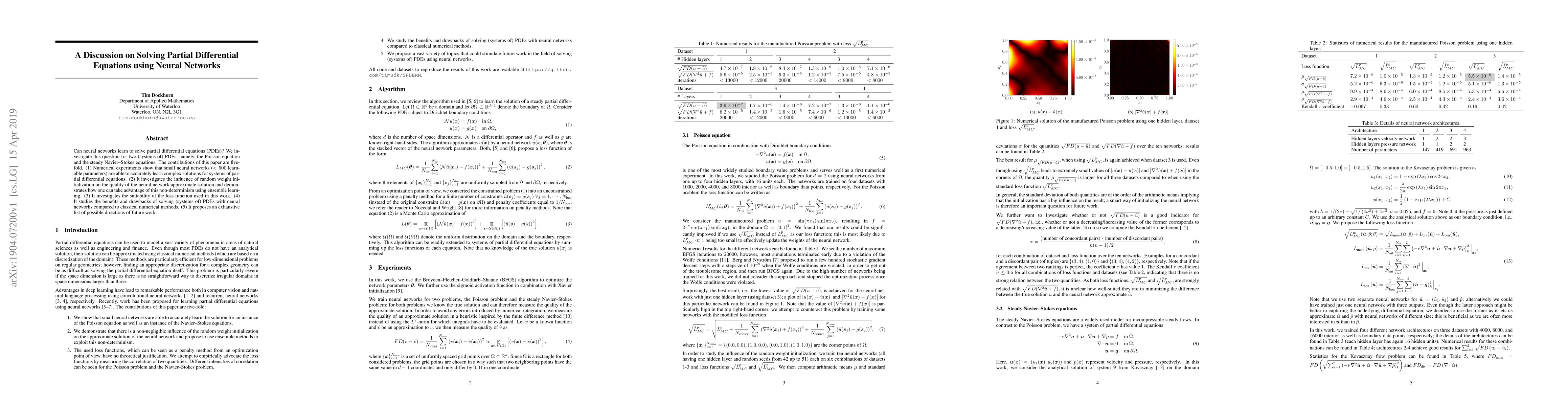 Can neural networks learn to solve partial differential equations (PDEs)? We investigate this question for two (systems of) PDEs, namely, the Poisson equation and the steady Navier--Stokes equations. The contributions of this paper are five-fold. (1) Numerical experiments show that small neural networks (< 500 learnable parameters) are able to accurately learn complex solutions for systems of partial differential equations. (2) It investigates the influence of random weight initialization on the quality of the neural network approximate solution and demonstrates how one can take advantage of this non-determinism using ensemble learning. (3) It investigates the suitability of the loss function used in this work. (4) It studies the benefits and drawbacks of solving (systems of) PDEs with neural networks compared to classical numerical methods. (5) It proposes an exhaustive list of possible directions of future work.