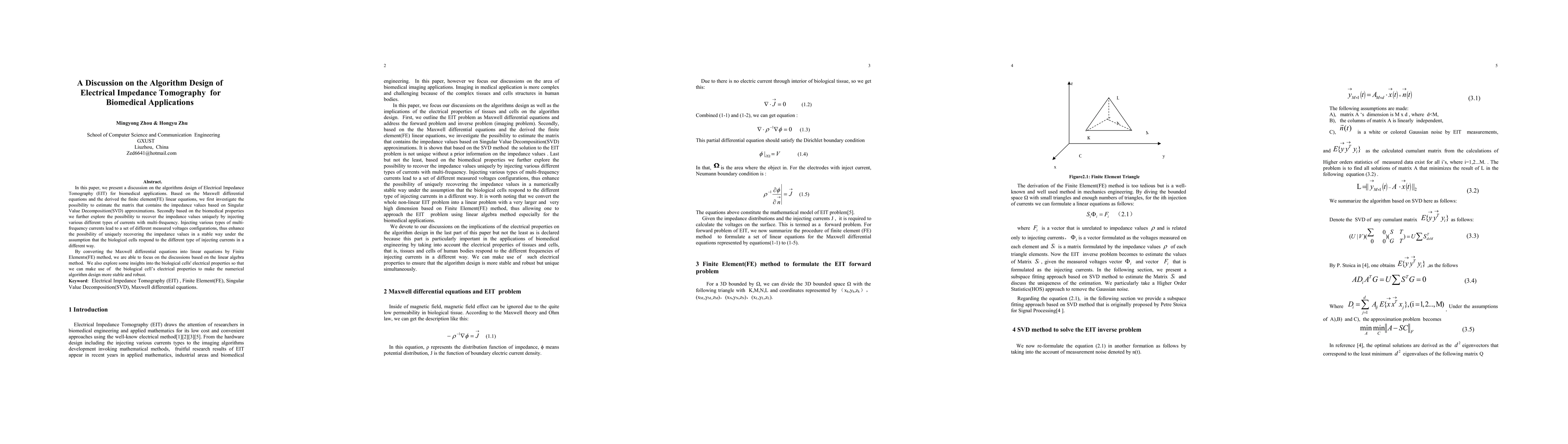 In this paper, we present a discussion on the algorithms design of Electrical Impedance Tomography (EIT) for biomedical applications. Based on the Maxwell differential equations and the derived the finite element(FE) linear equations, we first investigate the possibility to estimate the matrix that contains the impedance values based on Singular Value Decomposition(SVD) approximations. Secondly based on the biomedical properties we further explore the possibility to recover the impedance values uniquely by injecting various different types of currents with multi-frequency. Injecting various types of multi-frequency currents lead to a set of different measured voltages configurations, thus enhance the possibility of uniquely recovering the impedance values in a stable way under the assumption that the biological cells respond to the different type of injecting currents in a different way.