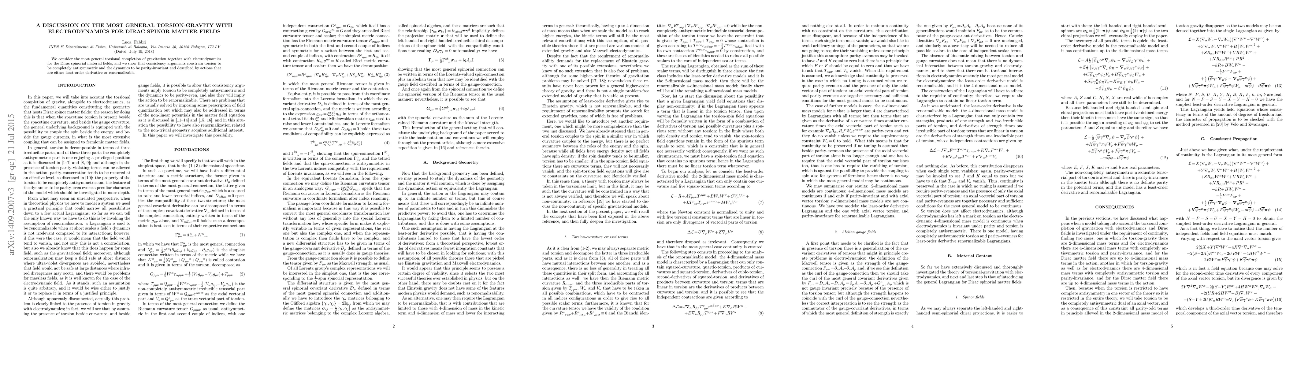 We consider the most general torsional completion of gravitation together with electrodynamics for the Dirac spinorial material fields, and we show that consistency arguments constrain torsion to be completely antisymmetric and the dynamics to be parity-invariant and described by actions that are either least-order derivative or renormalizable.