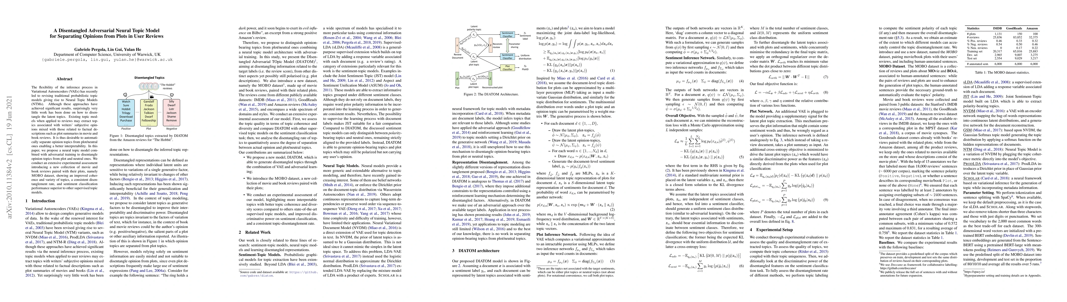 This paper introduces a novel Disentangled Adversarial Neural Topic Model to separate opinions from plot summaries in user reviews, using an adversarial training approach. Experiments on the new MOBO dataset demonstrate improved topic coherence, disentanglement, and sentiment classification performance compared to traditional supervised topic models.