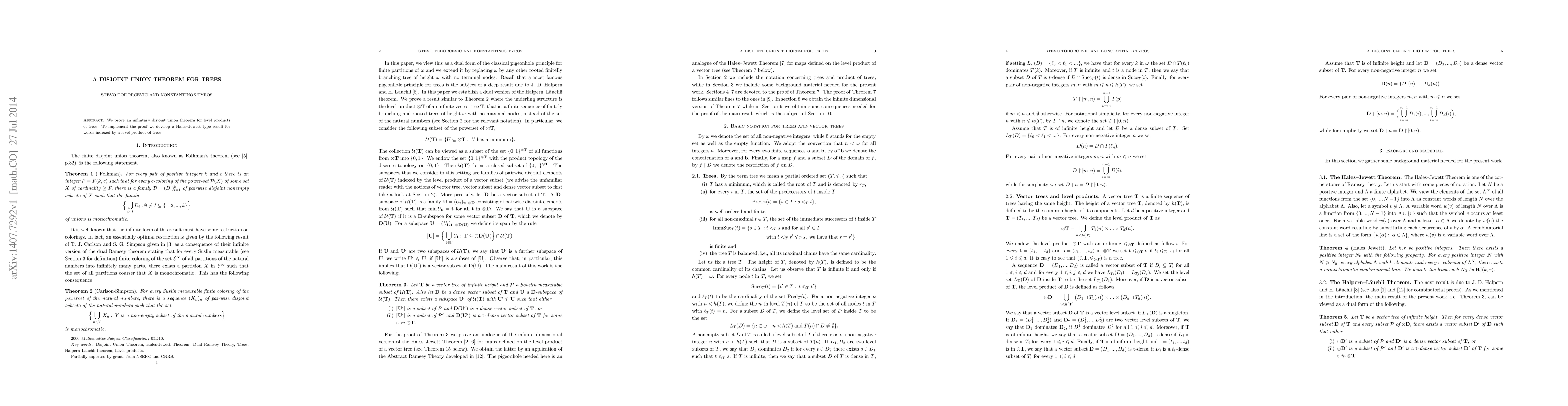 Summary: The paper proves an infinitary disjoint union theorem for tree level products and introduces a Hales-Jewett type result for words indexed by these level products to support the proof.
