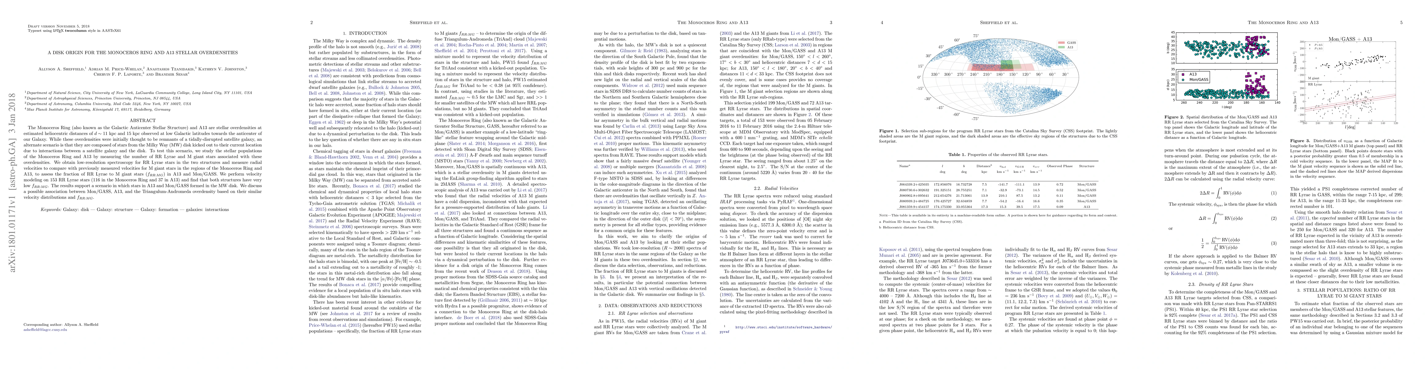 This paper investigates the origins of the Monoceros Ring and A13 stellar overdensities, proposing they are not remnants of a disrupted satellite galaxy but stars from the Milky Way disk ejected by satellite interactions. The study finds low ratios of RR Lyrae to M giant stars, supporting the disk origin hypothesis and suggesting a connection to the Triangulum-Andromeda overdensity.