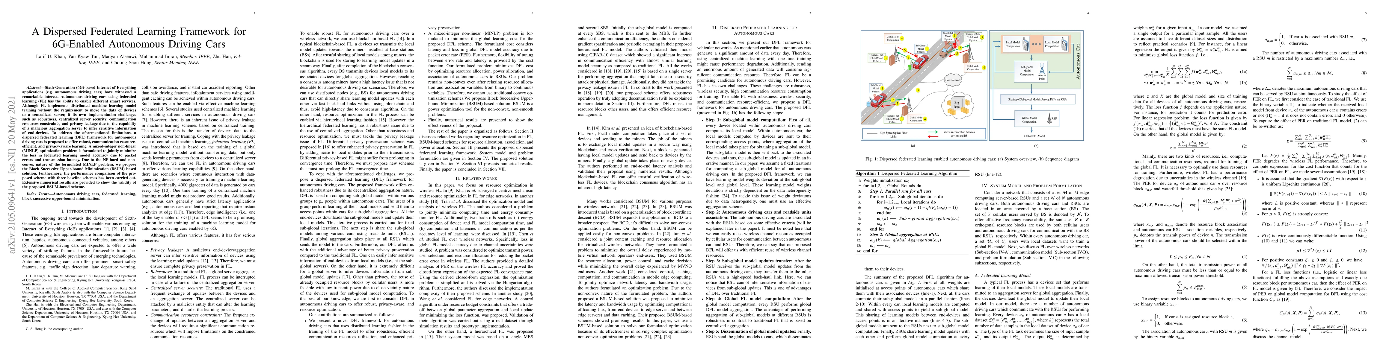 This paper proposes a dispersed federated learning (DFL) framework for 6G-enabled autonomous driving cars to tackle challenges like robustness, security, and privacy. The framework uses a Block Successive Upper-bound Minimization (BSUM) approach to optimize communication resource efficiency and minimize model accuracy loss due to packet errors and latency.