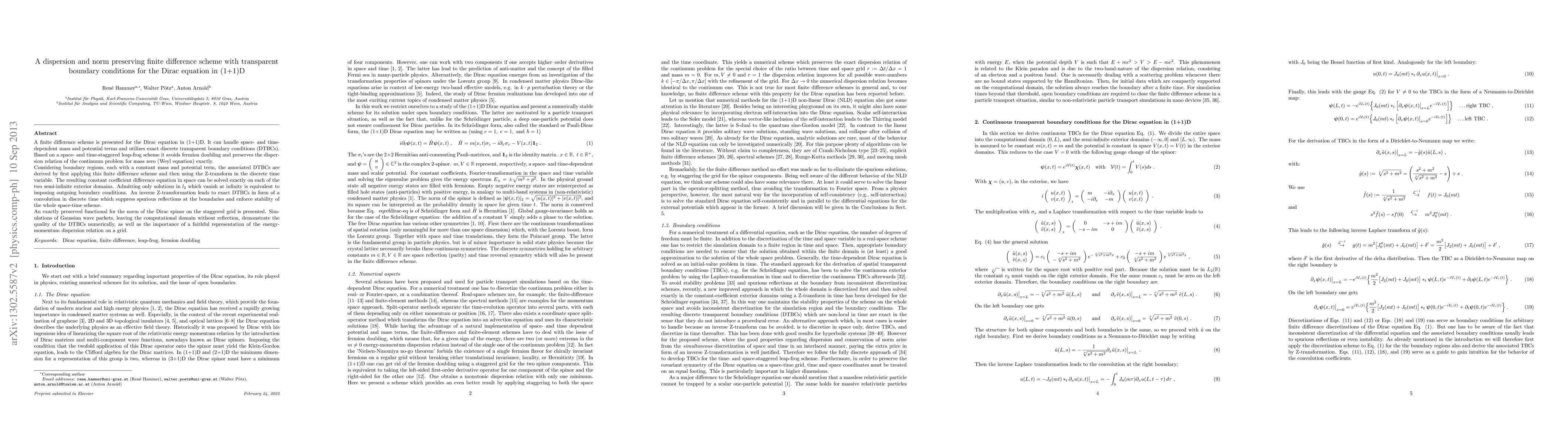 This paper introduces a finite difference scheme for the Dirac equation in (1+1)D that preserves the dispersion relation and norm, utilizing exact transparent boundary conditions to avoid spurious reflections. The scheme effectively handles varying mass and potential terms and ensures stability through an inverse Z-transform.