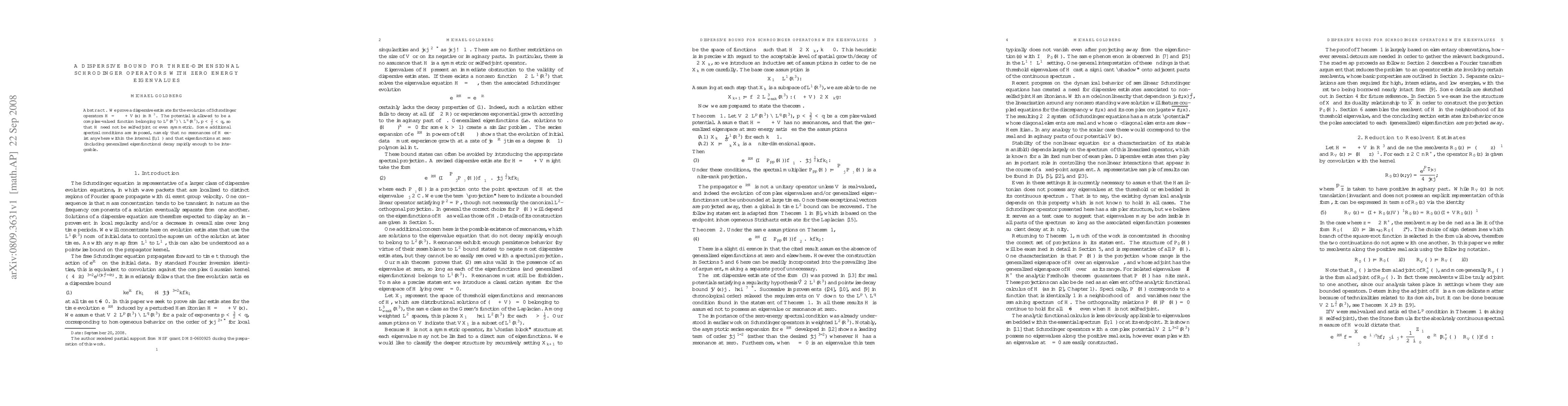 This paper establishes a dispersive estimate for three-dimensional Schrödinger operators $H = -\Delta + V(x)$ with complex-valued potentials in $L^p(\R^3)\cap L^q(\R^3)$ under conditions that exclude resonances and ensure rapid decay of eigenfunctions at zero energy.