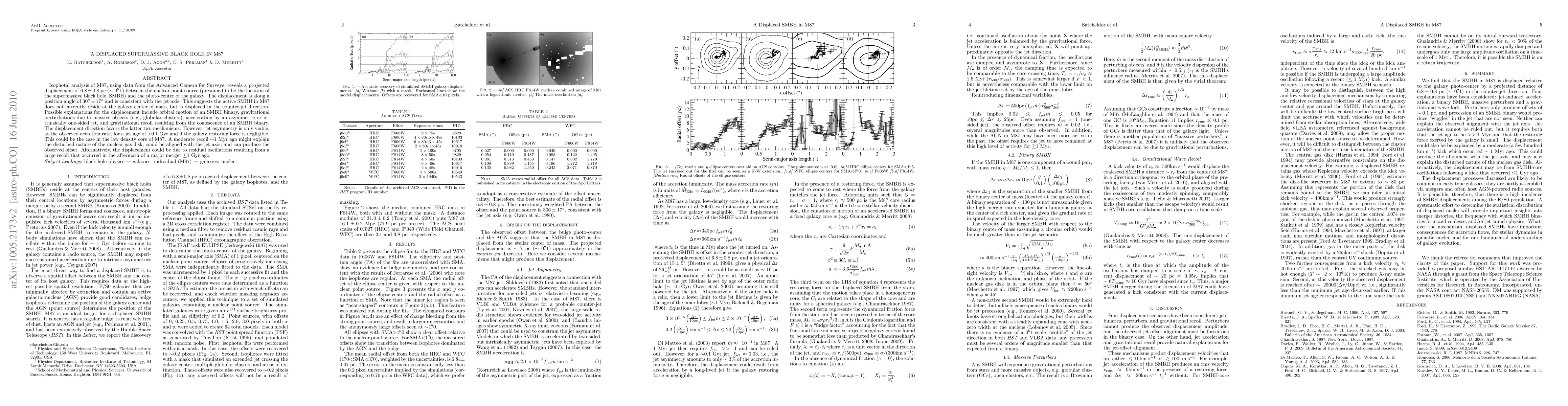Isophotal analysis of M87, using data from the Advanced Camera for Surveys, reveals a projected displacement of 6.8 +/- 0.8 pc (~ 0.1 arcsec) between the nuclear point source (presumed to be the location of the supermassive black hole, SMBH) and the photo-center of the galaxy. The displacement is along a position angle of 307 +/- 17 degrees and is consistent with the jet axis. This suggests the active SMBH in M87 does not currently reside at the galaxy center of mass, but is displaced in the counter-jet direction. Possible explanations for the displacement include orbital motion of an SMBH binary, gravitational perturbations due to massive objects (e.g., globular clusters), acceleration by an asymmetric or intrinsically one-sided jet, and gravitational recoil resulting from the coalescence of an SMBH binary. The displacement direction favors the latter two mechanisms. However, jet asymmetry is only viable, at the observed accretion rate, for a jet age of >0.1 Gyr and if the galaxy restoring force is negligible. This could be the case in the low density core of M87. A moderate recoil ~1 Myr ago might explain the disturbed nature of the nuclear gas disk, could be aligned with the jet axis, and can produce the observed offset. Alternatively, the displacement could be due to residual oscillations resulting from a large recoil that occurred in the aftermath of a major merger any time in the last 1 Gyr.