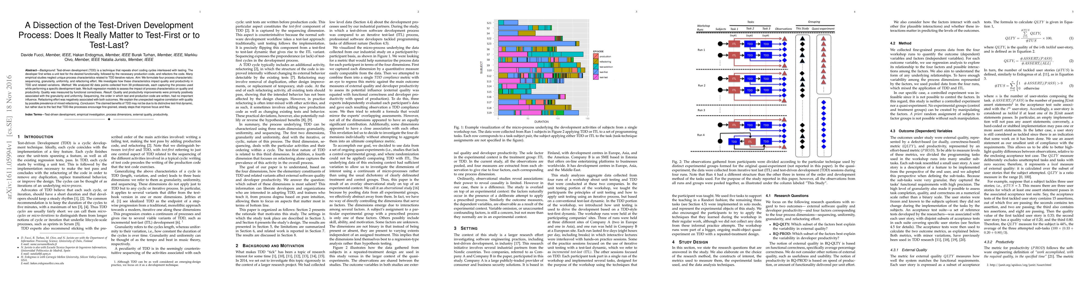 This study investigates the impact of test-driven development (TDD) process characteristics on software quality and productivity. Findings suggest that granularity and uniformity in TDD processes enhance quality and productivity, while sequencing (test-first vs. test-last) has negligible impact. Refactoring effort negatively correlates with both outcomes, indicating that TDD benefits may stem from the iterative, fine-grained approach rather than the test-first order.