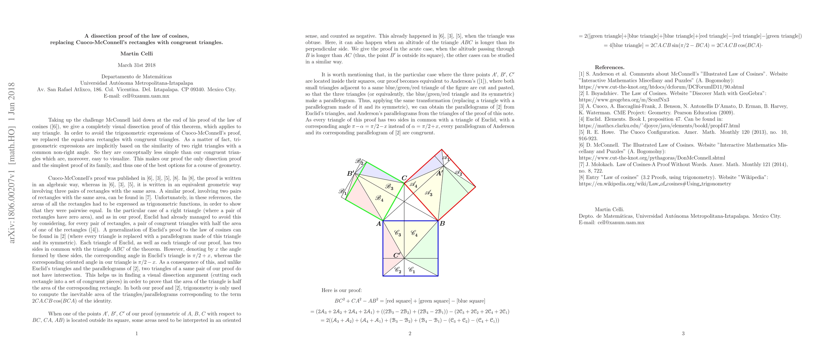 This paper presents a visual dissection proof of the law of cosines, using congruent triangles instead of rectangles, offering a more intuitive and straightforward geometric approach than trigonometric methods. This method is particularly effective for teaching geometry due to its simplicity and visual clarity.