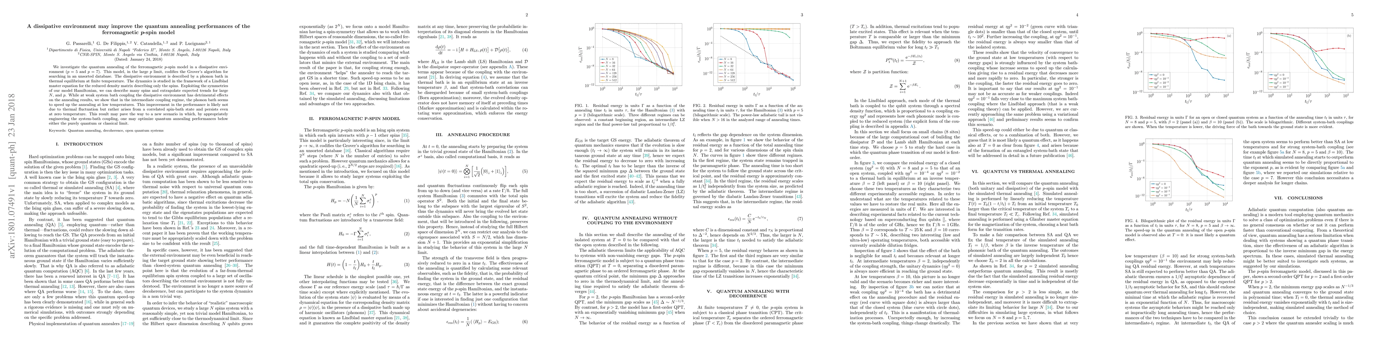 We investigate the quantum annealing of the ferromagnetic $ p $-spin model in a dissipative environment ($ p = 5 $ and $ p = 7 $). This model, in the large $ p $ limit, codifies the Grover's algorithm for searching in an unsorted database. The dissipative environment is described by a phonon bath in thermal equilibrium at finite temperature. The dynamics is studied in the framework of a Lindblad master equation for the reduced density matrix describing only the spins. Exploiting the symmetries of our model Hamiltonian, we can describe many spins and extrapolate expected trends for large $ N $, and $ p $. While at weak system bath coupling the dissipative environment has detrimental effects on the annealing results, we show that in the intermediate coupling regime, the phonon bath seems to speed up the annealing at low temperatures. This improvement in the performance is likely not due to thermal fluctuation but rather arises from a correlated spin-bath state and persists even at zero temperature. This result may pave the way to a new scenario in which, by appropriately engineering the system-bath coupling, one may optimize quantum annealing performances below either the purely quantum or classical limit.