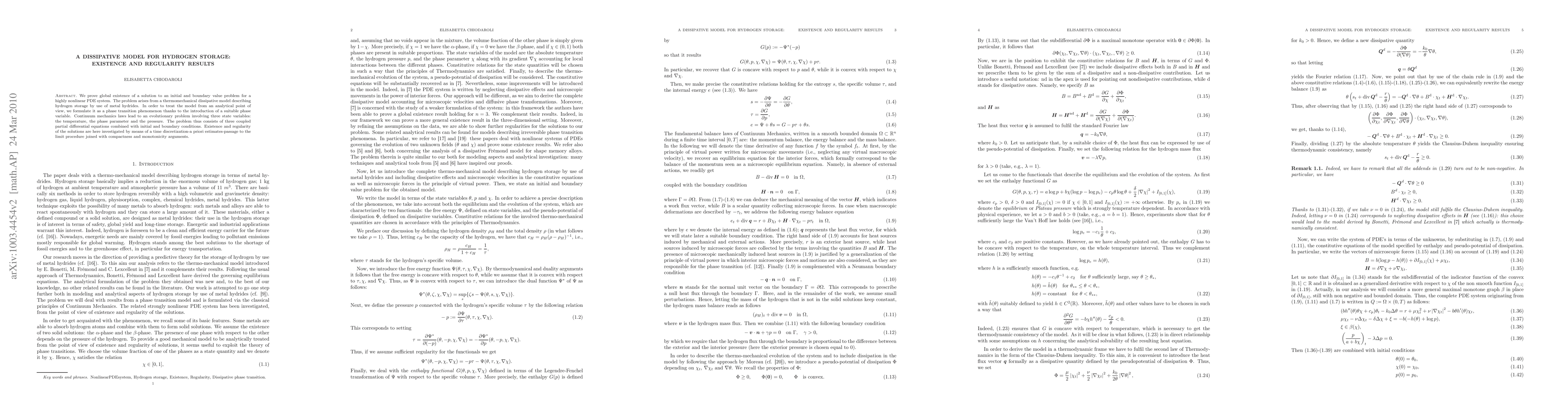 We prove global existence of a solution to an initial and boundary value problem for a highly nonlinear PDE system. The problem arises from a thermomechanical dissipative model describing hydrogen storage by use of metal hydrides. In order to treat the model from an analytical point of view, we formulate it as a phase transition phenomenon thanks to the introduction of a suitable phase variable. Continuum mechanics laws lead to an evolutionary problem involving three state variables: the temperature, the phase parameter and the pressure. The problem thus consists of three coupled partial differential equations combined with initial and boundary conditions. Existence and regularity of the solutions are here investigated by means of a time discretization-a priori estimates-passage to the limit procedure joined with compactness and monotonicity arguments.