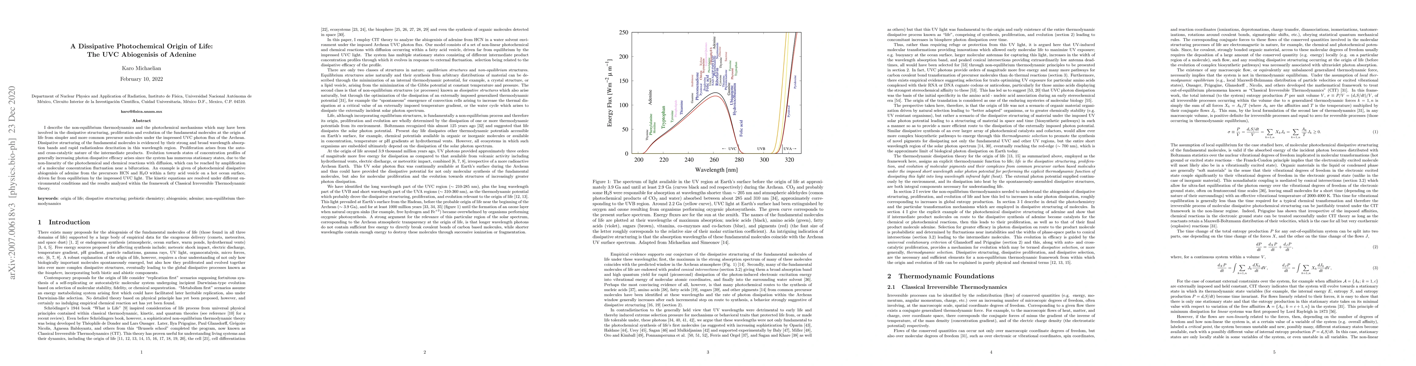 I describe the non-equilibrium thermodynamics and the photochemical mechanisms which may have been involved in the dissipative structuring, proliferation and evolution of the fundamental molecules at the origin of life from simpler and more common precursor molecules under the impressed UVC photon flux of the Archean. Dissipative structuring of the fundamental molecules is evidenced by their strong and broad wavelength absorption bands and rapid radiationless dexcitation in this wavelength region. Proliferation arises from the auto- and cross-catalytic nature of the intermediate products. Evolution towards states of concentration profiles of generally increasing photon disspative efficacy arises since the system has numerous stationary states, due to the non-linearity of the photochemical and chemical reactions with diffusion, which can be reached by amplification of a molecular concentration fluctuation near a bifurcation. An example is given of photochemical dissipative abiogenisis of adenine from the precursors HCN and H$_2$O within a fatty acid vesicle on a hot ocean surface, driven far from equilibrium by the impressed UVC light. The kinetic equations are resolved under different environmental conditions and the results analyzed within the framework of Classical Irreversible Thermodynamic theory.