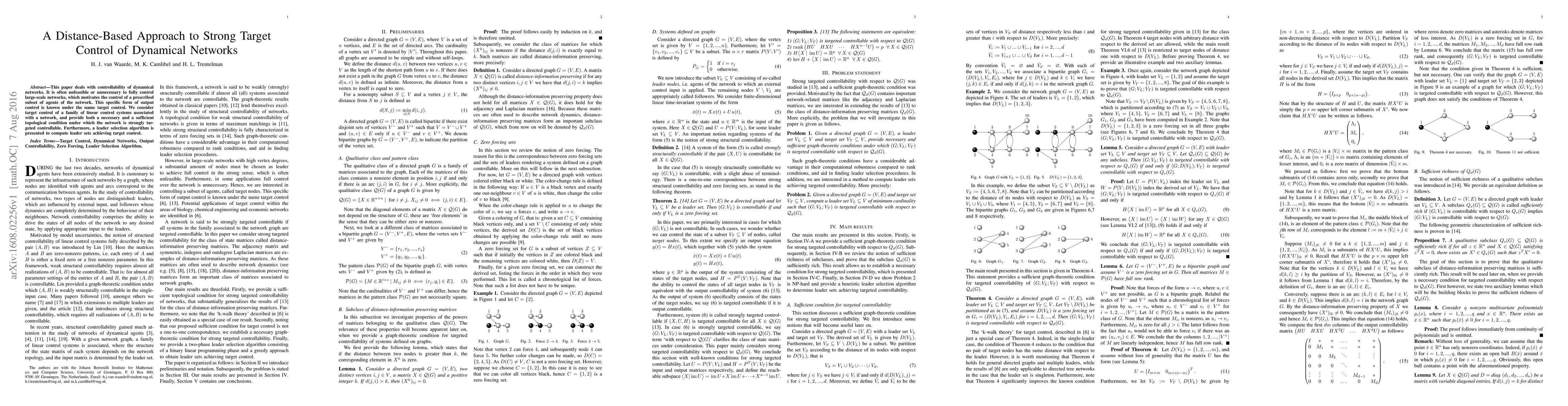 This paper proposes a distance-based approach to achieve strong target control of dynamical networks, providing necessary and sufficient topological conditions for such control and introducing a leader selection algorithm to identify effective leader sets.