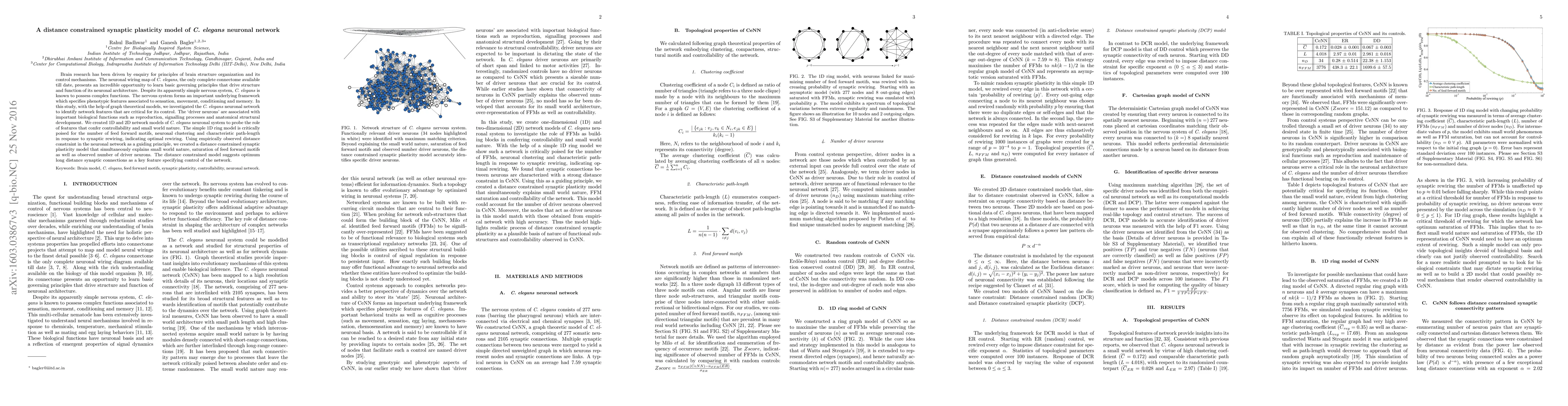 Brain research has been driven by enquiry for principles of brain structure organization and its control mechanisms. The neuronal wiring map of C. elegans, the only complete connectome available till date, presents an incredible opportunity to learn basic governing principles that drive structure and function of its neuronal architecture. Despite its apparently simple nervous system, C. elegans is known to possess complex functions. The neuronal architecture forms an important underlying framework which specifies phenotypic features associated to sensation, movement, conditioning and memory. In this study, with the help of graph theoretical models, we investigated the C. elegans neuronal network to identify network features that are critical for its control. The 'driver neurons' are associated with important biological functions such as reproduction, signalling processes and anatomical structural development. We created 1D and 2D network models of C. elegans neuronal system to probe the role of features that confer controllability and small world nature. The simple 1D ring model is critically poised for the number of feed forward motifs, neuronal clustering and characteristic path-length in response to synaptic rewiring, indicating optimal rewiring. Using empirically observed distance constraint in the neuronal network as a guiding principle, we created a distance constrained synaptic plasticity model that simultaneously explains small world nature, saturation of feed forward motifs as well as observed number of driver neurons. The distance constrained model suggests optimum long distance synaptic connections as a key feature specifying control of the network.