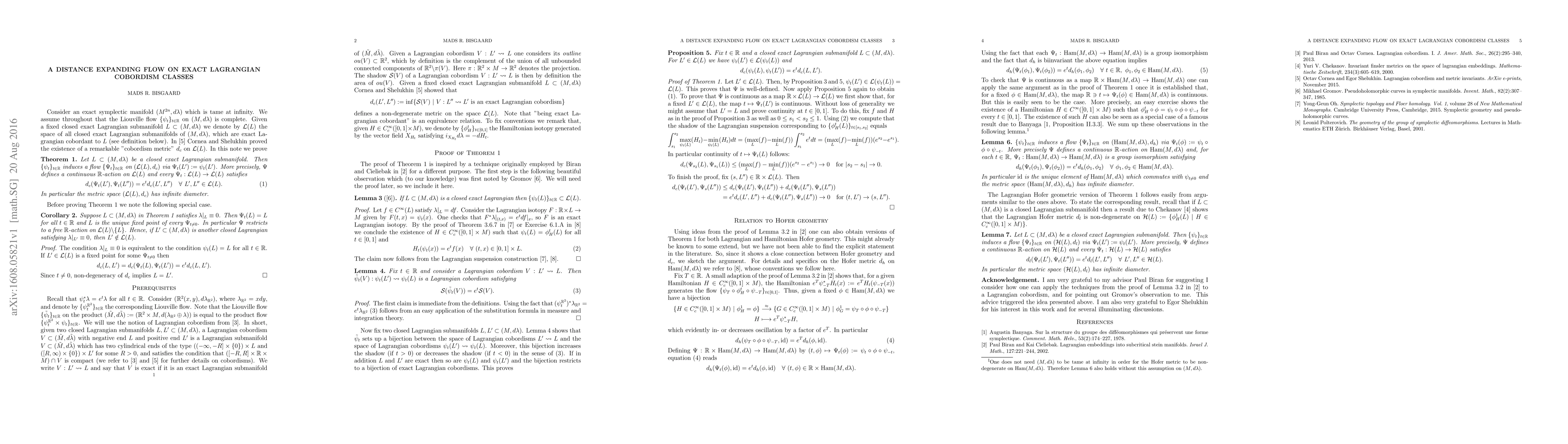 Given an exact Lagrangian $L$ of an exact symplectic manifold $(M,d\lambda )$, Cornea and Shelukhin recently introduced a remarkable "cobordism metric" $d_c$ on the exact Lagrangian cobordism class $\mathcal{L}(L)$ of $L$. In this note we show that the Liouville flow of $(M,d\lambda )$ induces a flow on $(\mathcal{L}(L),d_c)$ which expands cobordism distances. In particular we deduce that $(\mathcal{L}(L),d_c)$ has infinite diameter whenever the Liouville flow is complete. We also discuss (Hamiltonian and Lagrangian) Hofer-geometric versions of our result. The proof only uses elementary differential geometry.