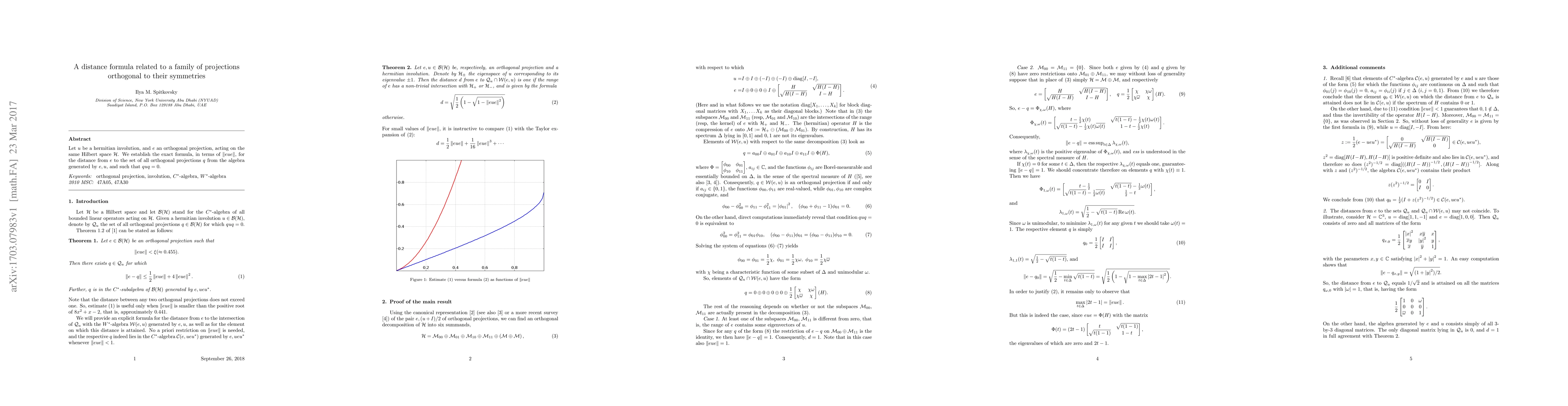 This paper presents a precise mathematical formula for the distance between an orthogonal projection 'e' and a set of projections 'q', which are orthogonal to their symmetries under a hermitian involution 'u' in the same Hilbert space. The formula is expressed in terms of the norm of 'eue'.