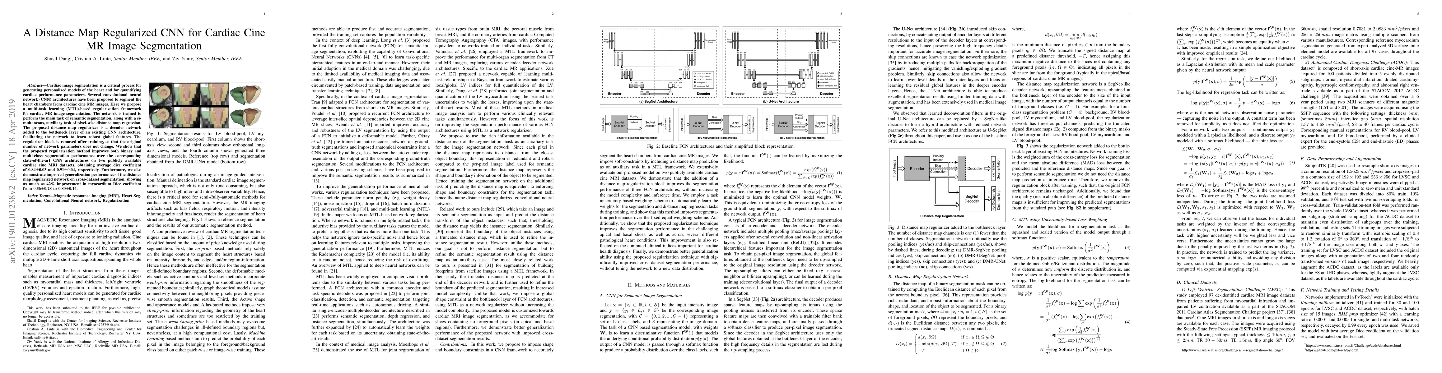 This paper proposes a multi-task learning framework with a distance map regularizer for cardiac cine MR image segmentation, enhancing CNN performance by incorporating a decoder network. The method improves segmentation accuracy and generalization, achieving notable Dice coefficients and up to 42% improvement in myocardium segmentation.