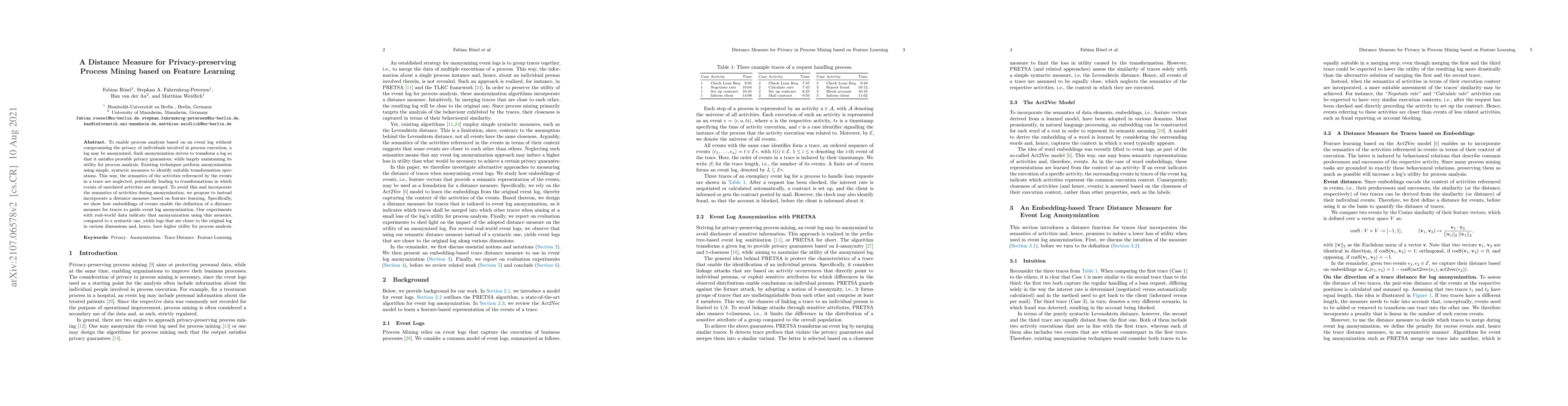 This paper proposes a novel distance measure for privacy-preserving process mining that uses feature learning to incorporate activity semantics during anonymization, leading to higher utility for process analysis compared to traditional syntactic measures. Experiments on real-world data show that this approach produces anonymized logs that retain more original log characteristics.