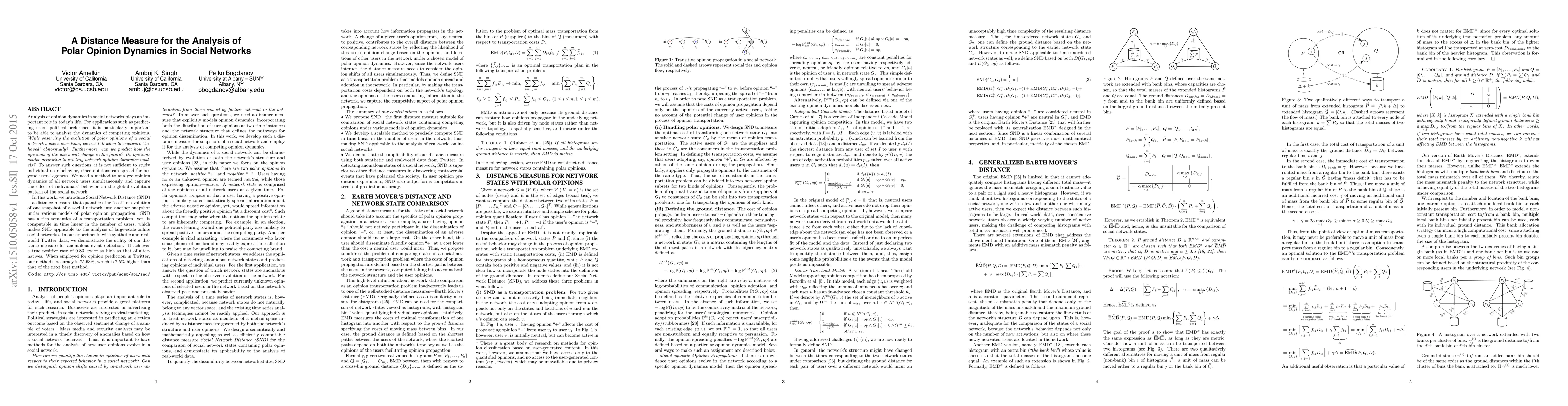 This paper introduces Social Network Distance (SND), a novel distance measure for analyzing the evolution of polar opinions across social networks. SND quantifies the "cost" of opinion propagation between network snapshots, enabling the detection of anomalous events and improving opinion prediction accuracy.