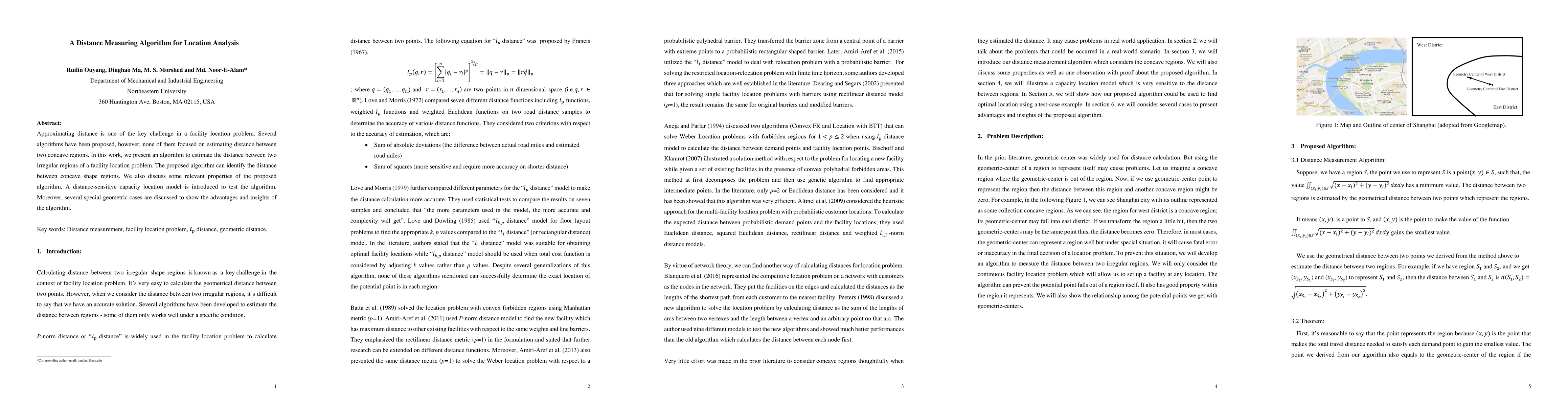 A new algorithm is proposed to estimate distance between two concave regions in facility location problems, providing a solution for irregular shapes and special geometric cases.
