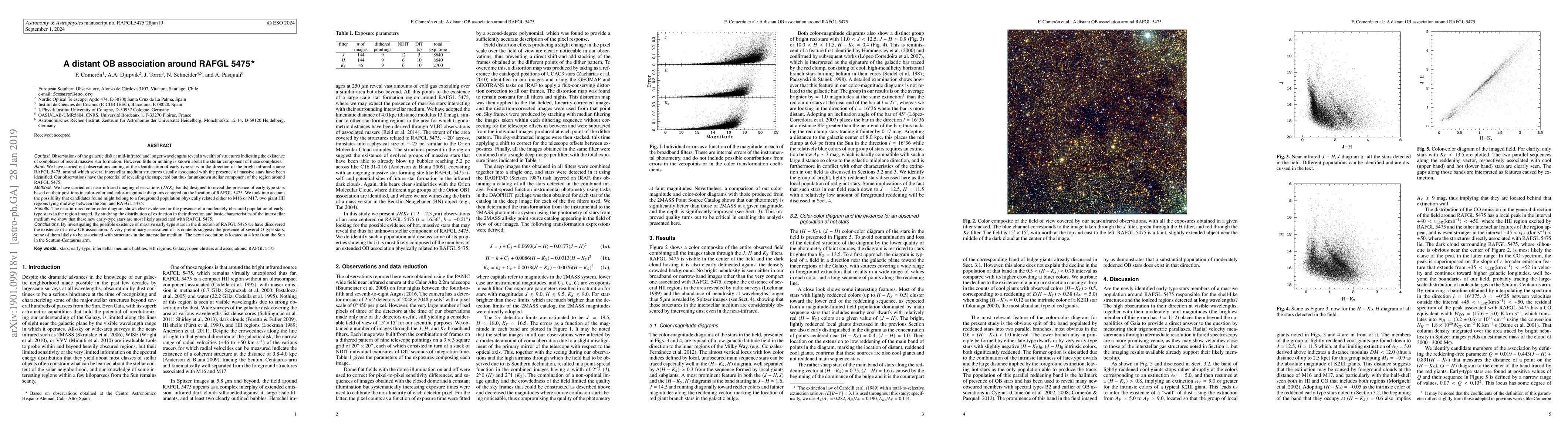 Observations of the galactic disk at mid-infrared and longer wavelengths reveal a wealth of structures indicating the existence of complexes of recent massive star formation. However, little or nothing is known about the stellar component of those complexes. We have carried out observations aiming at the identification of early-type stars in the direction of the bright infrared source RAFGL~5475, around which several interstellar medium structures usually associated with the presence of massive stars have been identified. Our observations have the potential of revealing the suspected but thus far unknown stellar component of the region around RAFGL~5475. We have carried out near-infrared imaging observations ($JHK_S$ bands) designed to reveal the presence of early-type stars based on their positions in color-color and color-magnitude diagrams centered on the location of RAFGL~5475. We took into account the possibility that candidates found might belong to a foreground population physically related either to M16 or M17, two giant HII regions lying midway between the Sun and RAFGL~5475. The near-infrared color-color diagram shows clear evidence for the presence of a moderately obscured population of early-type stars in the region imaged. By studying the distribution of extinction in their direction and basic characteristics of the interstellar medium we show that these new early-type stars are most likely associated with RAFGL~5475. By investigating the possible existence of massive early-type stars in the direction of RAFGL~5475 we have discovered the existence of a new OB association. A very preliminary assessment of its contents suggests the presence of several O-type stars, some of them likely to be associated with structures in the interstellar medium. The new association is located at 4 kpc from the Sun in the Scutum-Centaurus arm.