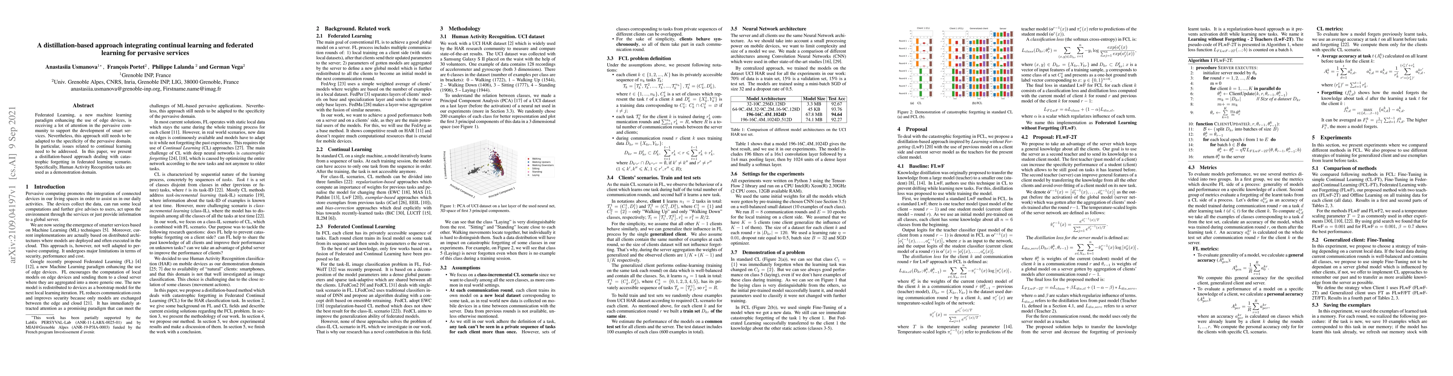 This paper proposes a distillation-based method to integrate continual learning within federated learning for pervasive services, addressing the challenge of catastrophic forgetting. The approach is demonstrated through Human Activity Recognition tasks.