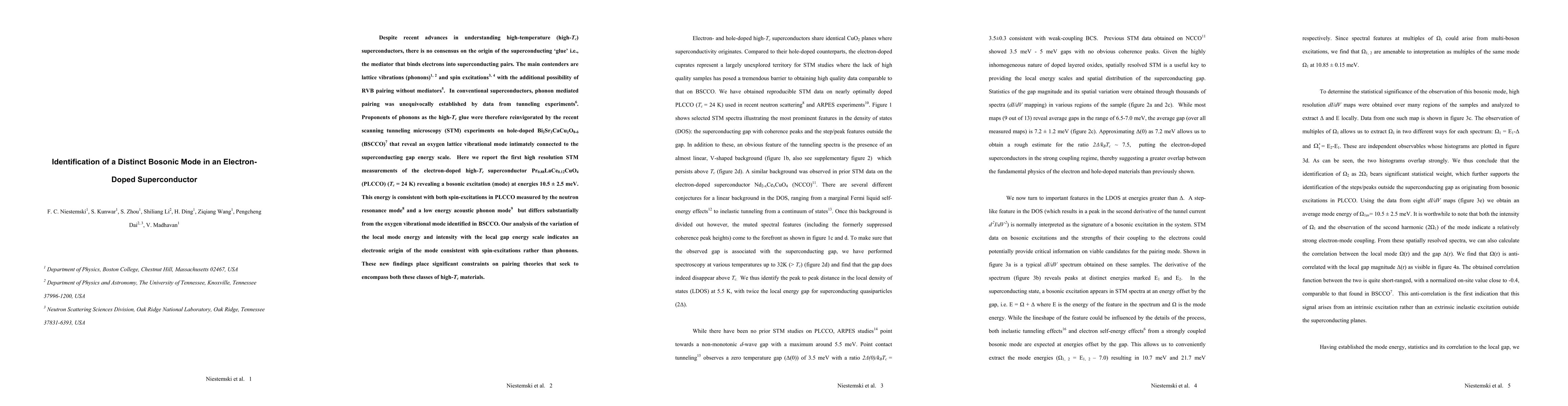This paper reports high-resolution scanning tunnelling microscopy measurements on the electron-doped high-Tc superconductor Pr0.88LaCe0.12CuO4, revealing a distinct bosonic mode at 10.5 ± 2.5 meV, suggesting spin-excitations as the likely mediator of superconductivity rather than phonons.