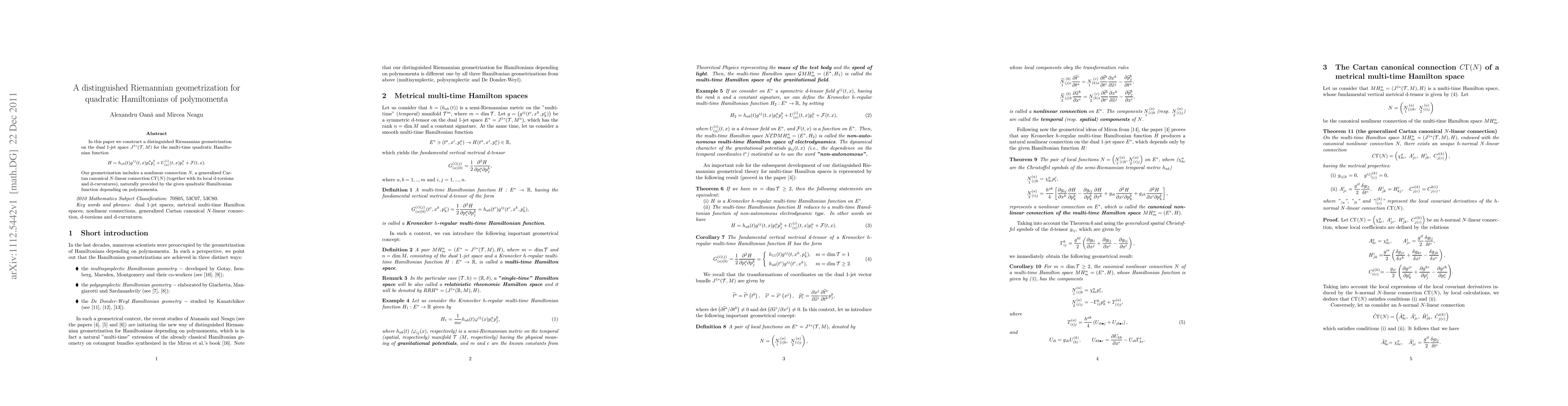 In this paper we construct a distinguished Riemannian geometrization on the dual 1-jet space J^{1*}(T,M) for the multi-time quadratic Hamiltonian functions. Our geometrization includes a nonlinear connection N, a generalized Cartan canonical N-linear connection (together with its local d-torsions and d-curvatures), naturally provided by a given quadratic Hamiltonian function depending on polymomenta.