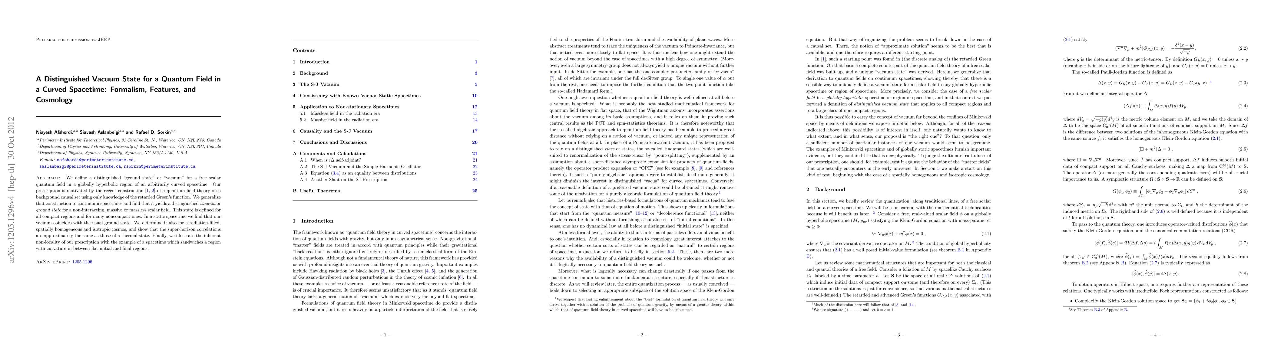 We define a distinguished "ground state" or "vacuum" for a free scalar quantum field in a globally hyperbolic region of an arbitrarily curved spacetime. Our prescription is motivated by the recent construction of a quantum field theory on a background causal set using only knowledge of the retarded Green's function. We generalize that construction to continuum spacetimes and find that it yields a distinguished vacuum or ground state for a non-interacting, massive or massless scalar field. This state is defined for all compact regions and for many noncompact ones. In a static spacetime we find that our vacuum coincides with the usual ground state. We determine it also for a radiation-filled, spatially homogeneous and isotropic cosmos, and show that the super-horizon correlations are approximately the same as those of a thermal state. Finally, we illustrate the inherent non-locality of our prescription with the example of a spacetime which sandwiches a region with curvature in-between flat initial and final regions.