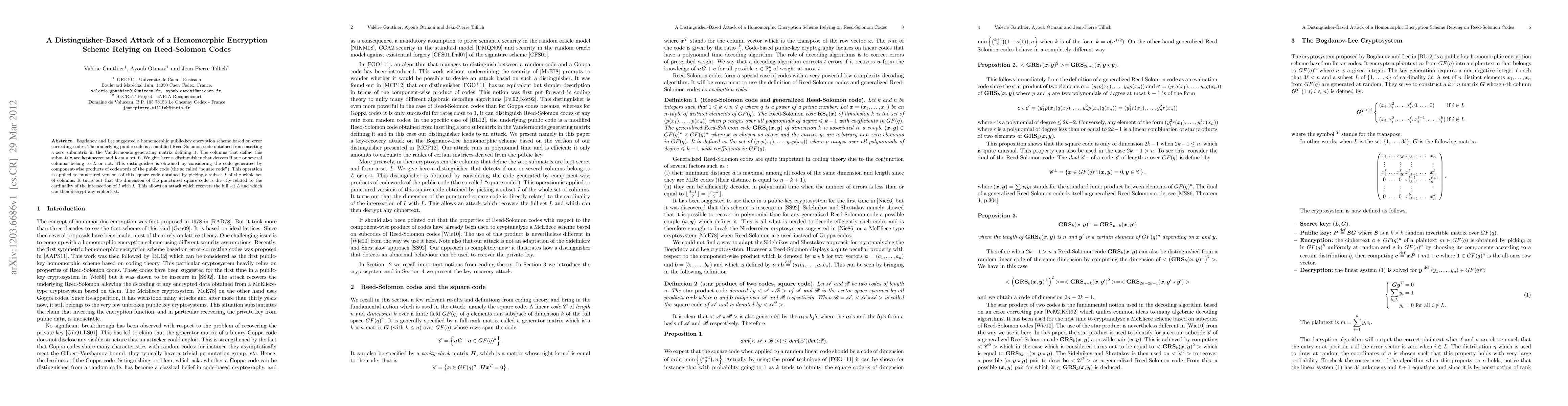 Researchers have discovered a way to break a homomorphic encryption scheme by analyzing how well certain products of code words can distinguish between hidden columns of the underlying Reed-Solomon code. This allows an attacker to recover the hidden column set and decrypt any ciphertext.