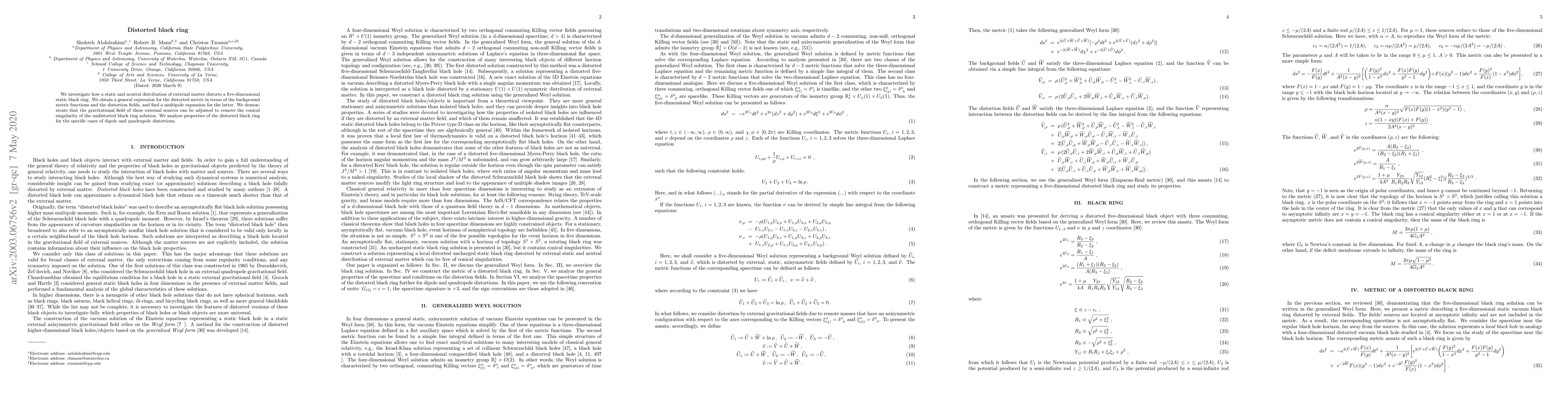 This paper explores the effects of static and neutral external matter on a 5-dimensional static black ring, deriving a general expression for the distorted metric and demonstrating how the gravitational field can eliminate the undistorted ring's conical singularity. It specifically examines the properties of the distorted black ring under dipole and quadrupole distortions.