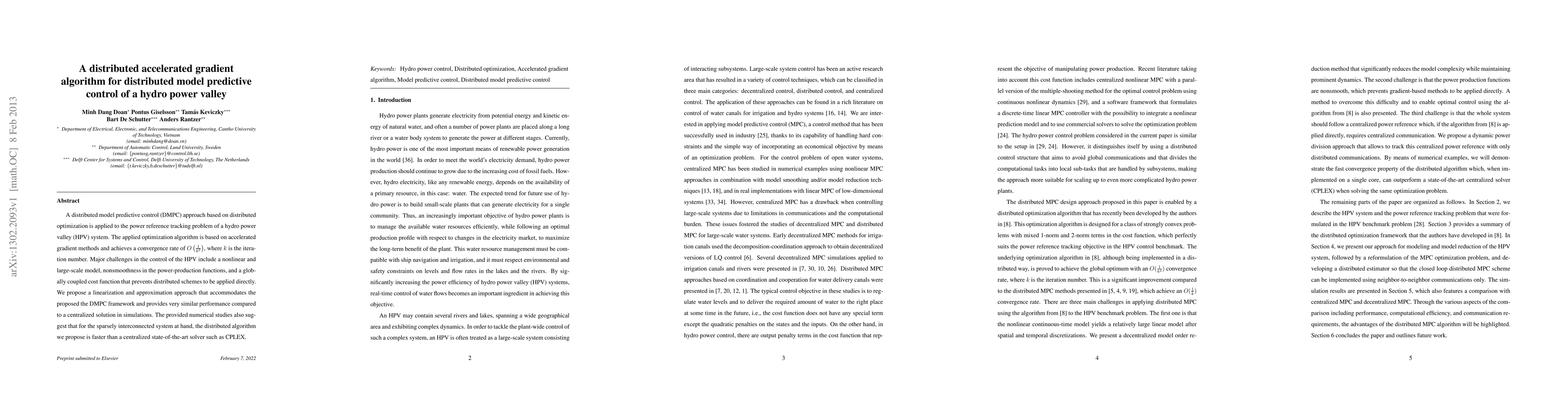 This paper proposes a distributed accelerated gradient algorithm for model predictive control in a hydro power valley system, addressing challenges of nonlinearity, nonsmoothness, and large-scale models. The algorithm achieves O(1/k^2) convergence and outperforms centralized solvers in distributed settings.