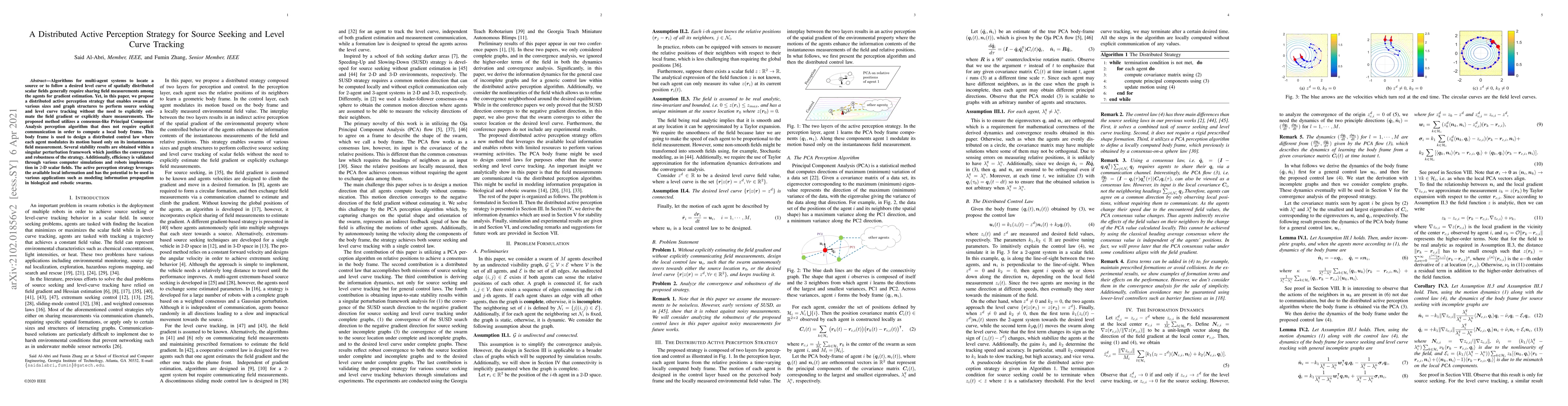 This paper proposes a distributed active perception strategy for multi-agent systems to locate a source or track level curves without gradient estimation or measurement sharing. It utilizes a consensus-based PCA algorithm to compute a local body frame, enabling each agent to modulate its motion based on local field measurements, validated through simulations and robot implementations.