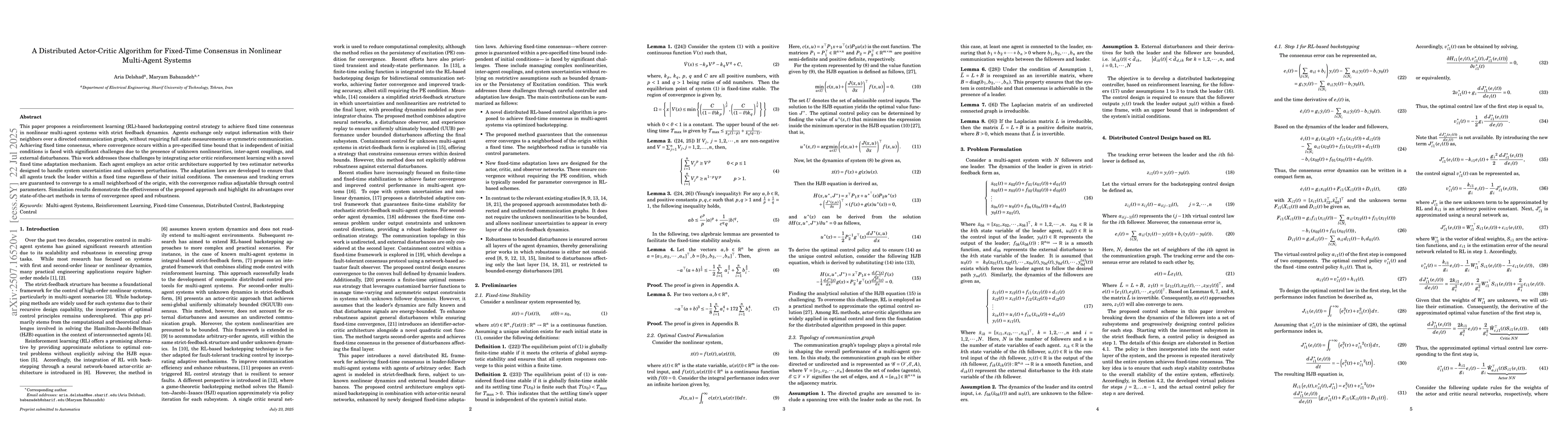 This paper proposes a reinforcement learning (RL)-based backstepping control strategy to achieve fixed time consensus in nonlinear multi-agent systems with strict feedback dynamics. Agents exchange only output information with their neighbors over a directed communication graph, without requiring full state measurements or symmetric communication. Achieving fixed time consensus, where convergence occurs within a pre-specified time bound that is independent of initial conditions is faced with significant challenges due to the presence of unknown nonlinearities, inter-agent couplings, and external disturbances. This work addresses these challenges by integrating actor critic reinforcement learning with a novel fixed time adaptation mechanism. Each agent employs an actor critic architecture supported by two estimator networks designed to handle system uncertainties and unknown perturbations. The adaptation laws are developed to ensure that all agents track the leader within a fixed time regardless of their initial conditions. The consensus and tracking errors are guaranteed to converge to a small neighborhood of the origin, with the convergence radius adjustable through control parameters. Simulation results demonstrate the effectiveness of the proposed approach and highlight its advantages over state-of-the-art methods in terms of convergence speed and robustness.