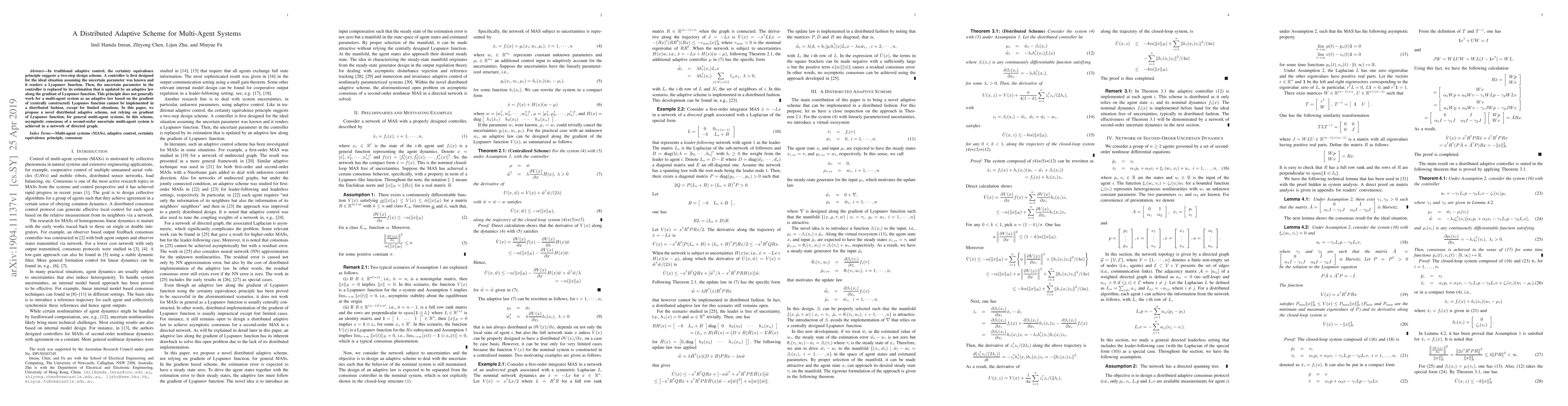 In traditional adaptive control, the certainty equivalence principle suggests a two-step design scheme. A controller is first designed for the ideal situation assuming the uncertain parameter was known and it renders a Lyapunov function. Then, the uncertain parameter in the controller is replaced by its estimation that is updated by an adaptive law along the gradient of Lyapunov function. This principle does not generally work for a multi-agent system as an adaptive law based on the gradient of (centrally constructed) Lyapunov function cannot be implemented in a distributed fashion, except for limited situations. In this paper, we propose a novel distributed adaptive scheme, not relying on gradient of Lyapunov function, for general multi-agent systems. In this scheme, asymptotic consensus of a second-order uncertain multi-agent system is achieved in a network of directed graph.