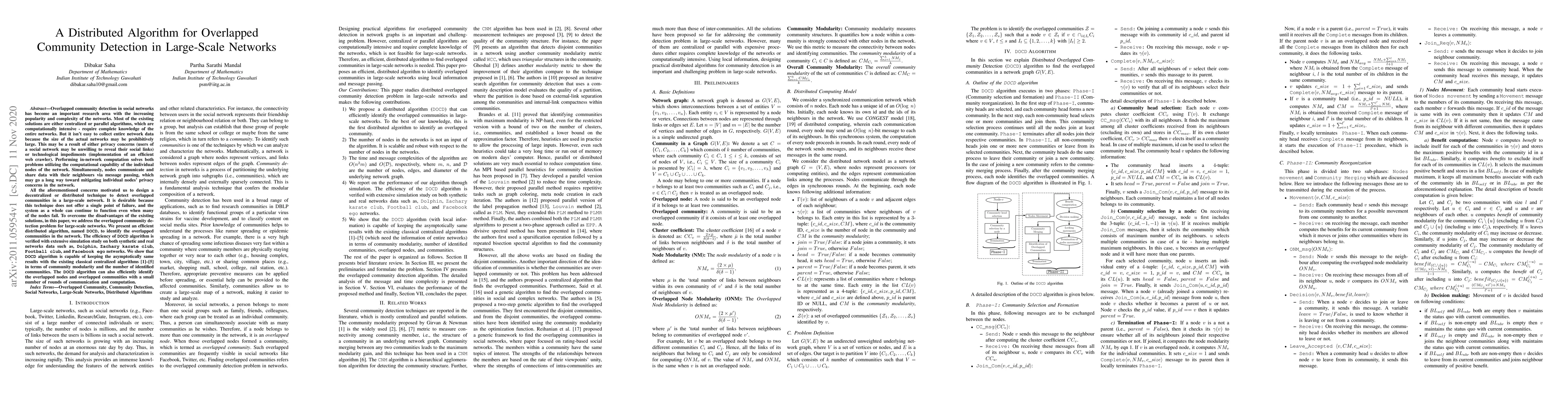 This paper proposes a distributed algorithm, DOCD, for detecting overlapped communities in large-scale networks, addressing the limitations of centralized and parallel methods. The algorithm leverages in-network computation and local communication between nodes to achieve efficient community detection while mitigating privacy concerns and scalability issues.