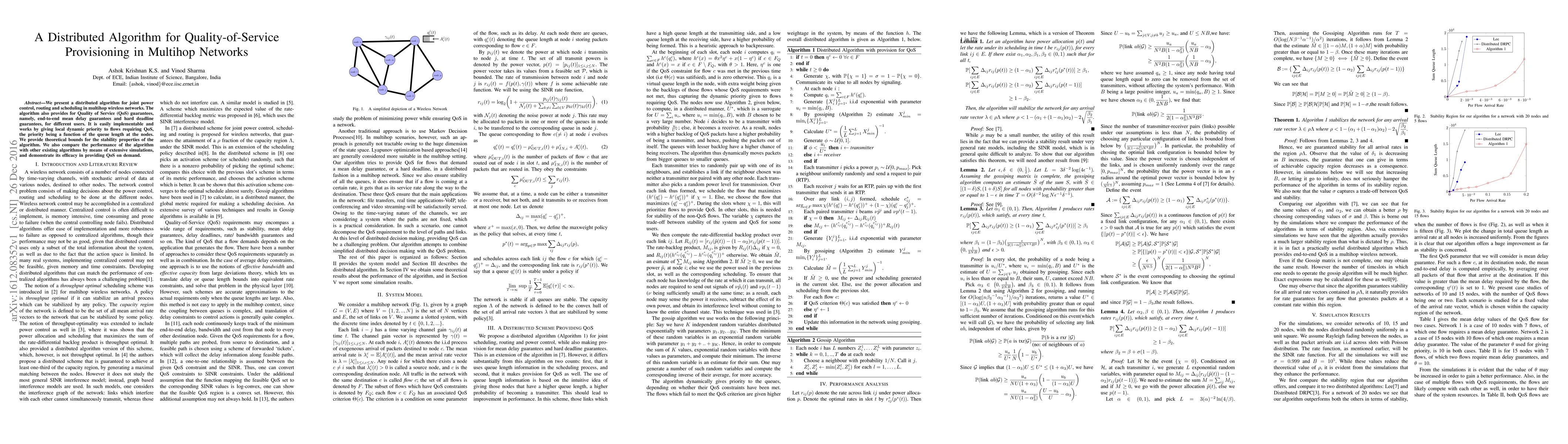 We present a distributed algorithm for joint power control, routing and scheduling in multihop wireless networks. The algorithm also provides for Quality of Service (QoS) guarantees, namely, end-to-end mean delay guarantees and hard deadline guarantees, for different users. It is easily implementable and works by giving local dynamic priority to flows requiring QoS, the priority being a function of the queue length at the nodes. We provide theoretical bounds for the stability properties of the algorithm. We also compare the performance of the algorithm with other existing algorithms by means of extensive simulations, and demonstrate its efficacy in providing QoS on demand.